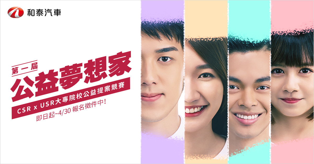 和泰汽車為實踐企業社會責任(CSR),並培育多元領域人才,看準國內青年學子勇於表現自我、重視自我價值,及樂於創新挑戰等鮮明特徵,結合企業的力量與大學生的熱情一同回饋社會(CSR x USR),於2019年展開『公益夢想家』計畫,藉由公益提案競賽,並提供實作津貼補助,為學子打造展現創意與實踐能力的舞台,攜手大學生創造更美好的台灣。即日起開跑,報名徵件至2019年4月30日。