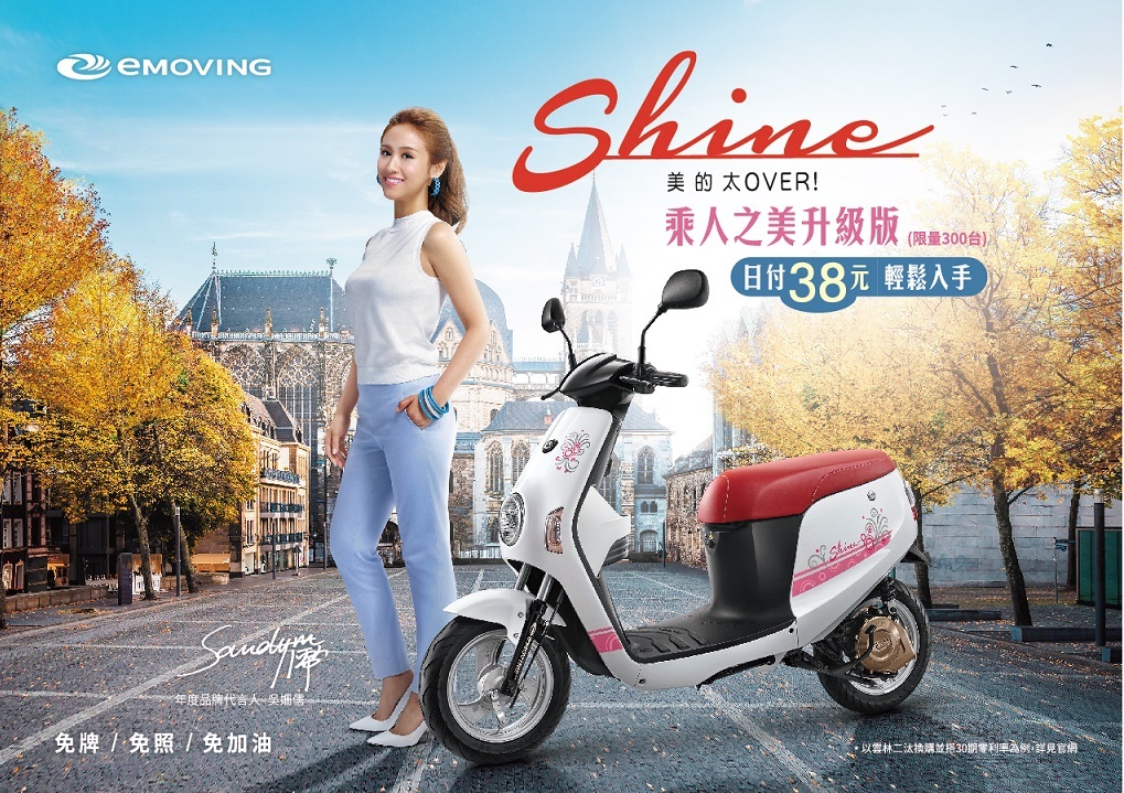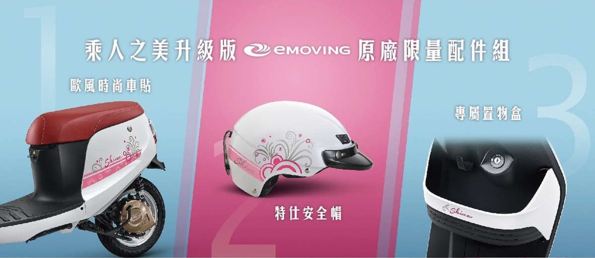 emoving為搶攻女性機車族群瞄準更大的女性市場,並提前歡慶母親節檔期應景推出emoving Shine「乘人之美升級版」歐風限量車款,限量300台,車身搭配歐風古典圖騰的原廠設計車貼,讓整體更加亮眼,加上專屬置物盒及獨一無二的原廠配件-歐風特仕安全帽,即日起只要日付38元的銅板價就能軽鬆入手,讓物價驚驚漲薪水沒漲的小資族購車零負擔!對於騎乘里程需求較高的消費者,更提供即日起購買Shine再享第二顆電池加購現折$3,600元(含安裝、限13Ah電池)的優惠方案,精打細算讓您騎乘久久。