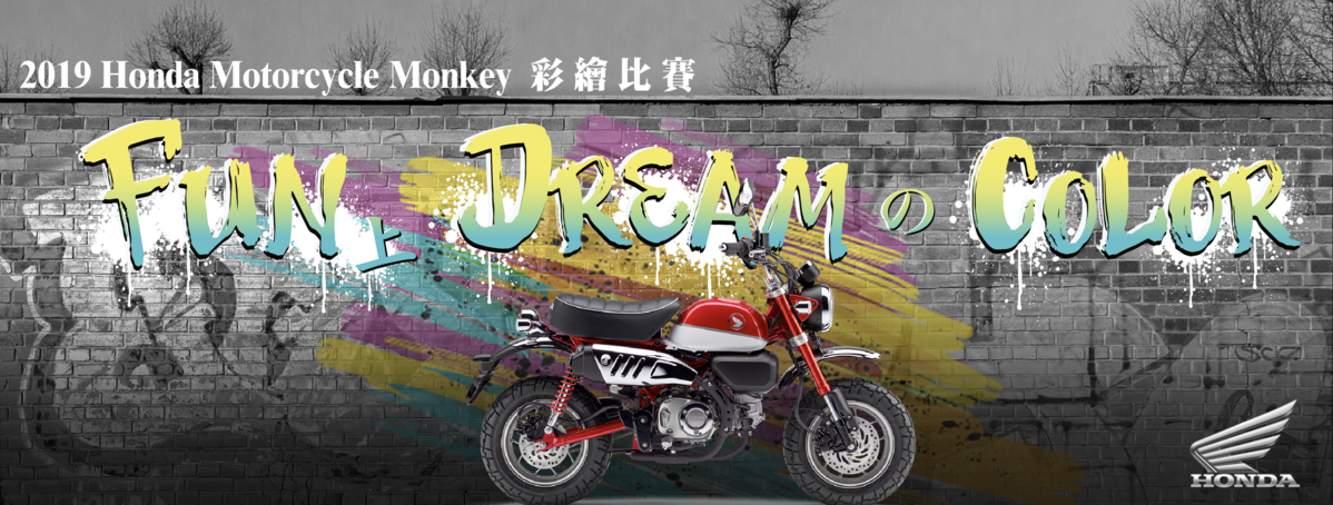 為讓更多消費者以及各年齡層的朋友體驗Honda獨有的二輪樂趣,Honda Taiwan將於2019/4/15起至2019/5/31止,舉辦Monkey彩繪比賽,消費者可至全國Honda Motorcycle 經銷據點索取活動畫紙或於活動網頁下載檔案自行列印,填上你/妳心目中最喜歡的Monkey配色與創作,並依規定完成作品繳交,將有機會獲得豐富大獎!!
