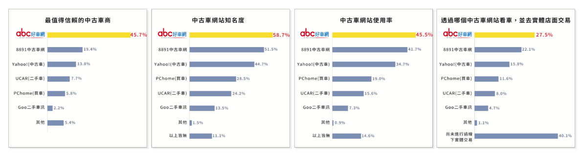 歡慶abc好車網蟬聯中古車網站知名度/使用率/實體交易率/信賴度4冠王,即日起推出好康優惠雙重慶!