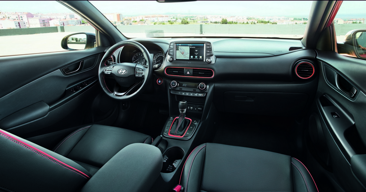 車室控台以高質感軟質塑料鋪陳,藉由安全帶、空調面板、排檔座、出風口等外框,及座椅縫線採熱血鮮紅色調Red-Line套件註2映襯,凸顯KONA強烈的性能風格,搭配6:4椅背傾倒設計靈活增加車主擺放需求。講求便利且提升駕駛駕駛視野安全,透過控台中央8吋懸浮式觸控螢幕整合Apple Carplay/Android Auto設計,結合手機無線充電裝置等3C元素點綴,勁化型更提供8吋全彩多功能HUD抬頭顯示器兼具車速、定速、BCW與LDW資訊,讓KONA擁有前衛的時尚科技感。