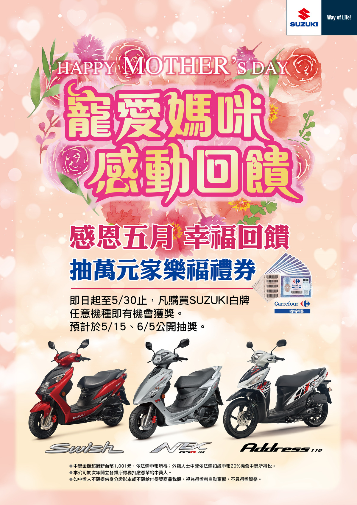 一年一度的母親節,台鈴SUZUKI感謝全天下母親的辛勞,特別推出”寵愛媽咪,感動回饋”專案,即日起至5/30止,只要購買台鈴SUZUKI白牌全車系,就有機會獲得一萬元的家樂福禮券,本月共有兩次抽獎機會,孝敬媽咪正是時候。(第一次抽獎日期:5/15,第二次抽獎日期:6/5)