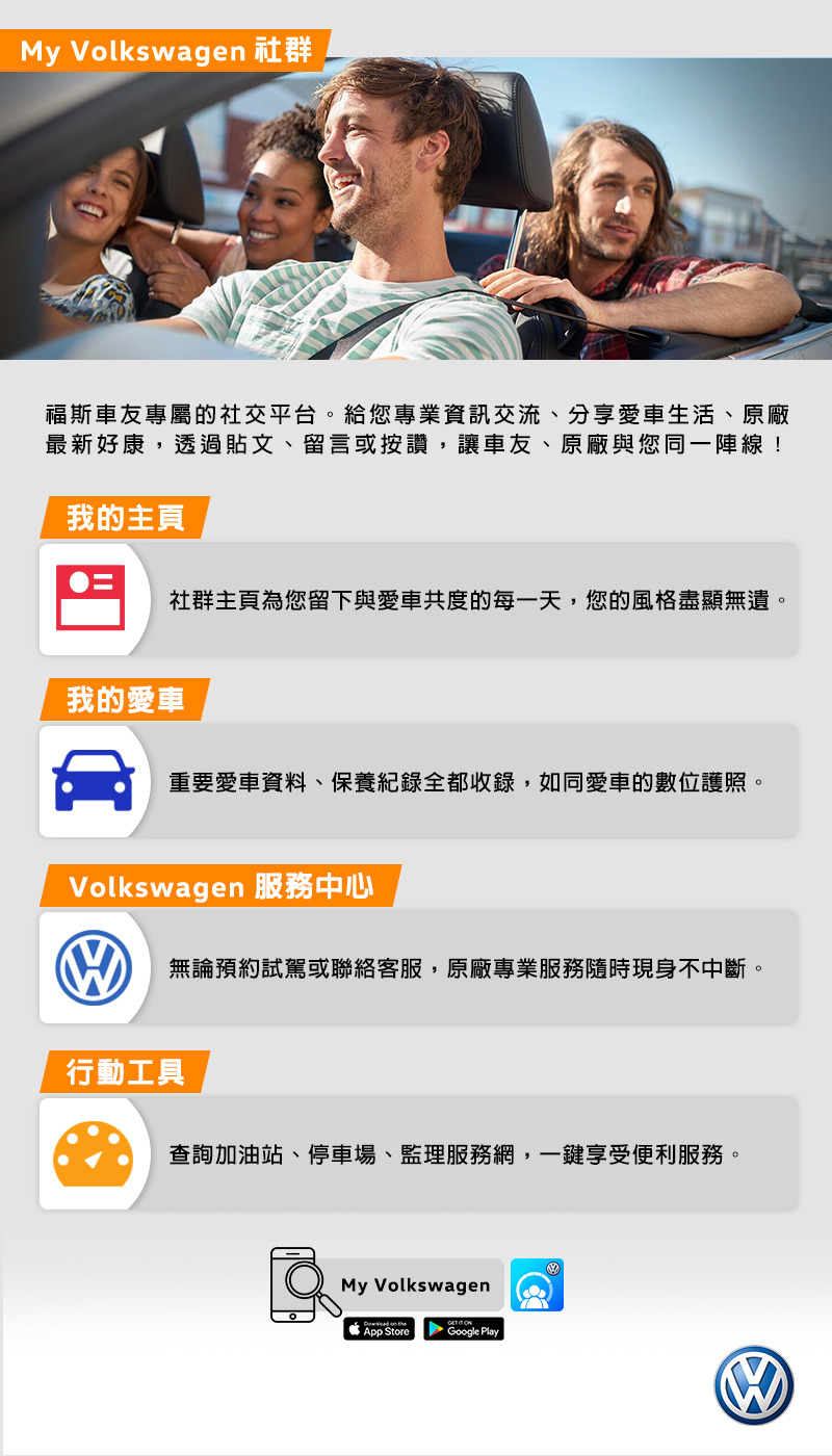 台灣福斯汽車持續提供與德國原廠同步的高品質服務和最新科技,強調以人為本的Volkswagen,此次推出專屬車主的智慧型手機應用程式,讓車主與Volkswagen溝通零距離,更能成為緊密連結的最佳利器。APP不只提供車主保養與行車等功能性服務,同時首次加入「My Volkswagen」社群功能,讓車主在專屬的社群平台上,與志同道合的車友交流互動,串聯精彩豐富的每一天。