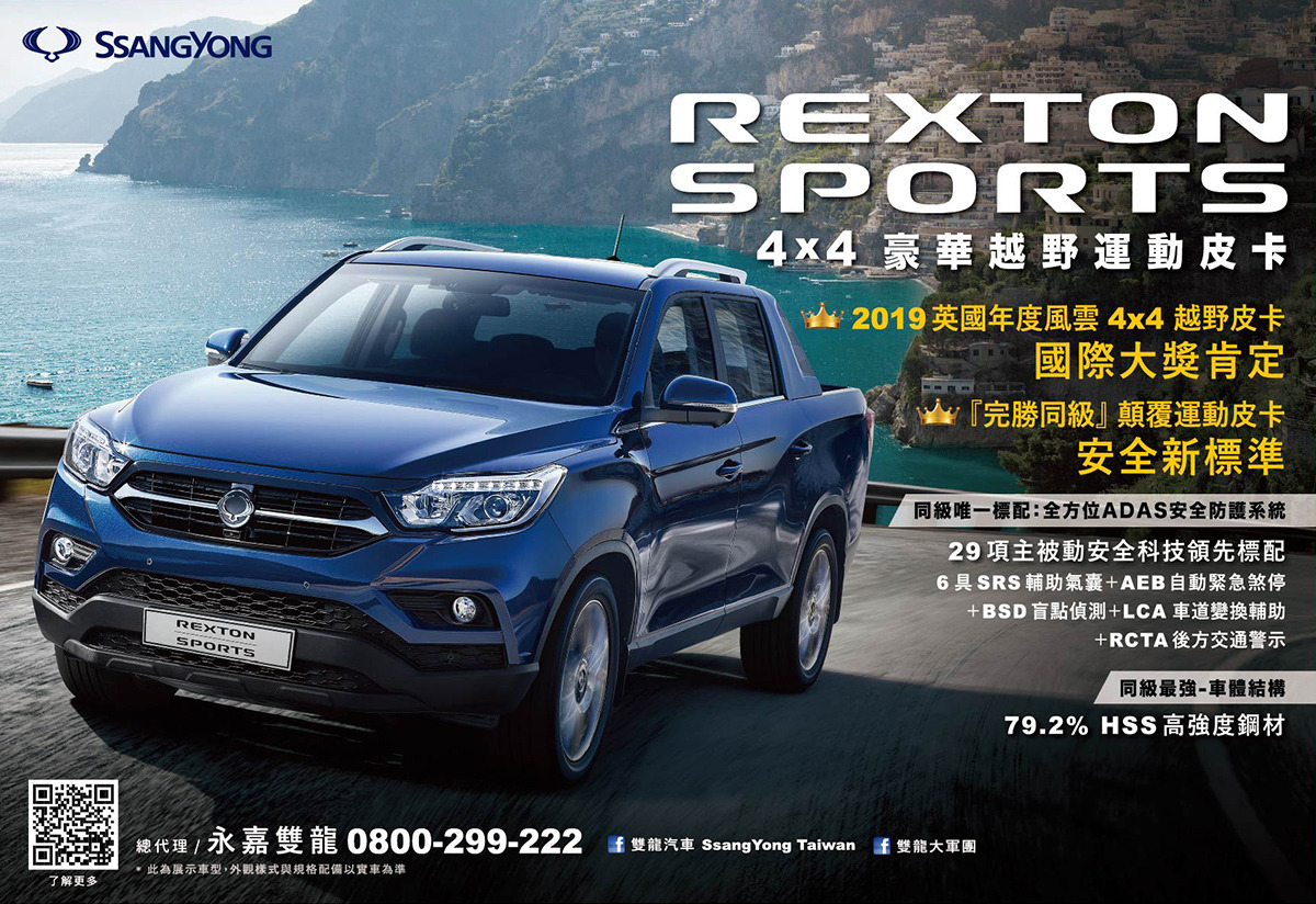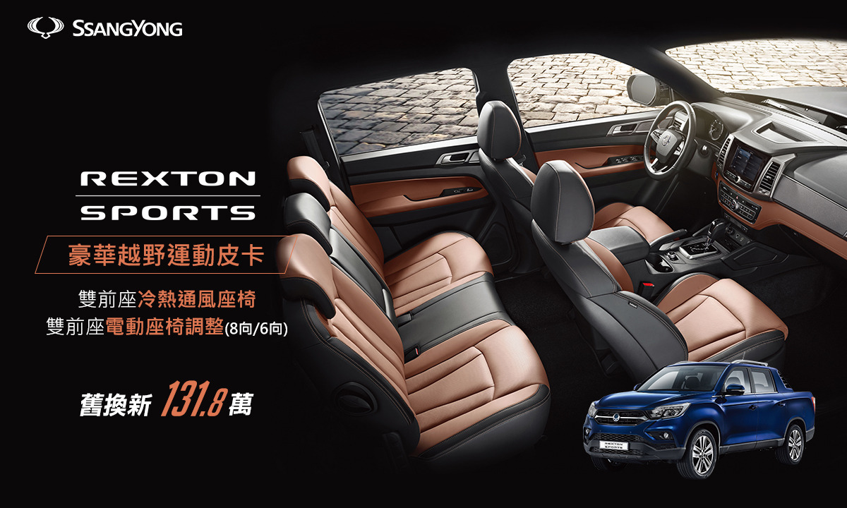 SsangYong REXTON SPORTS於今年4月9日正式於台灣市場販售,以同級最低的售價(建議售價NT$136.8萬),超乎想像展現豪華越野運動皮卡之姿,核心動力搭載2.2L e-XDI柴油渦輪引擎,配備2H/4H/4L電子式旋鈕加力箱、4TRONIC智慧型四輪驅動系統讓駕駛者自信征服險峻地形。