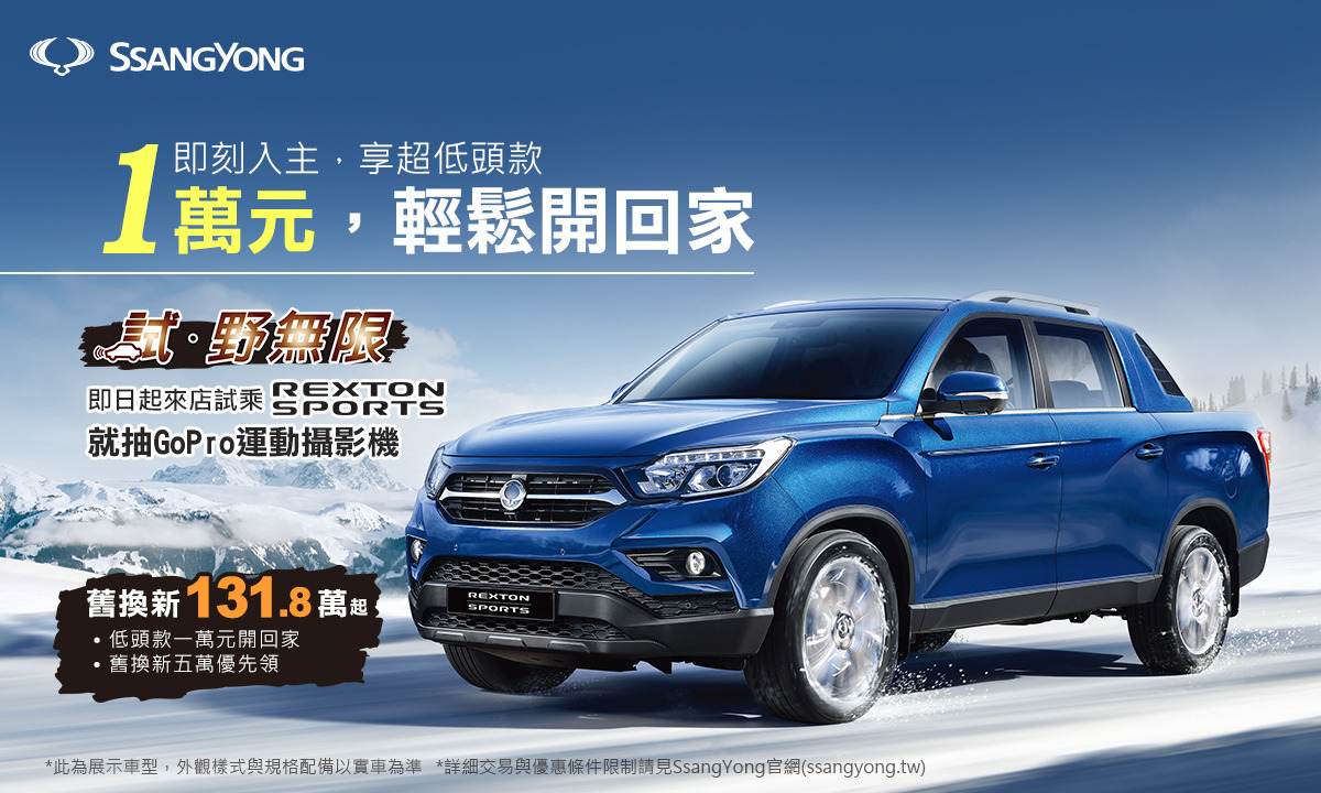 SsangYong總代理永嘉雙龍汽車本月特別推出【REXTON SPORTS試,野無限】促銷活動,凡於本月底來店試駕REXTON SPORTS運動休旅皮卡,就有機會抽GoPro Hero運動攝影機(建議售價NT$9,900)乙組,月底前購買REXTON SPORTS還享低頭款1萬元入主優惠,搭配政府汰舊換新政策,還可享5萬元補助不用等,REXTON SPORTS舊換新價僅需131.8萬元,是目前市面上最便宜的運動休旅皮卡,提供熱愛露營戶外休閒活動的消費者更超值的選擇。