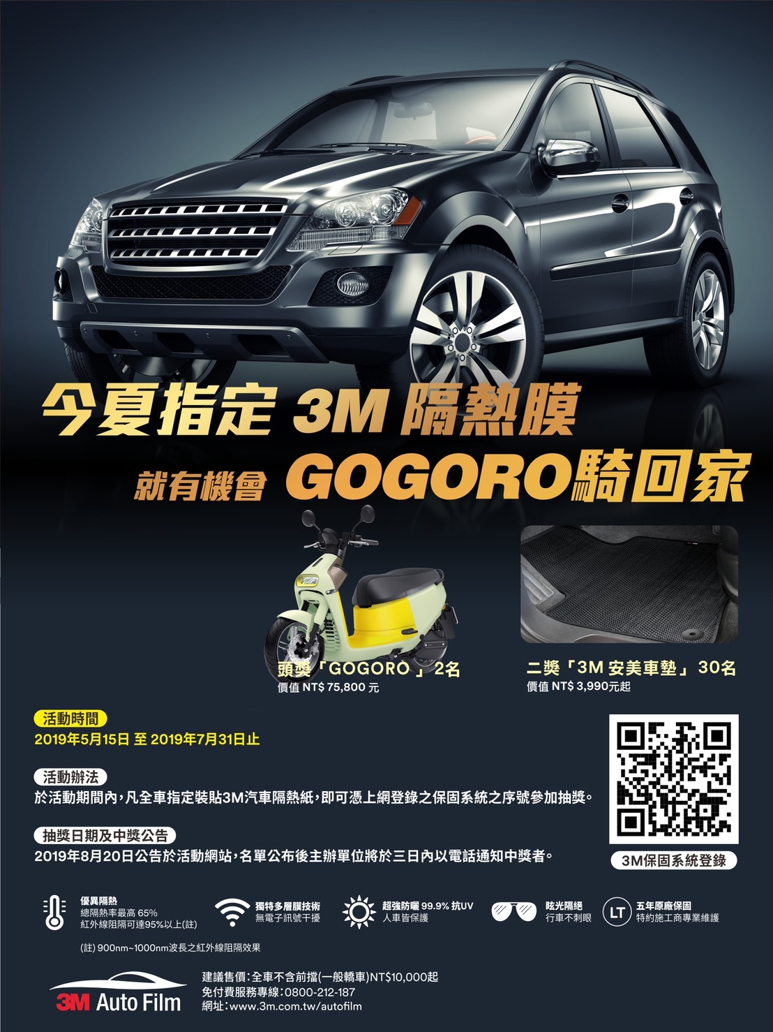 隨著梅雨季節的陰雨不斷,宣告炎熱夏季即將到來,動輒35度以上的驚人高溫,更伴著過量紫外線一同威脅人體皮膚。除了出門隨時做好防曬準備以外,您與您的愛車更要做好萬全的隔熱防護。身為全球隔熱紙領導品牌,美商3M特別於夏季來臨前推出夏季促銷活動,凡於2019年5月15日起至2019年7月31日止全車指定安裝3M汽車隔熱紙,憑上網登錄保固系統之序號即可獲得抽獎機會,最大獎將提供全新推出的 Gogoro 3 Plus Smartscooter® 智慧雙輪兩台。選擇3M隔熱紙一起度過夏季考驗,還有機會抽中市值新台幣75,980元的最新電動機車,優惠活動絕對不可缺席!