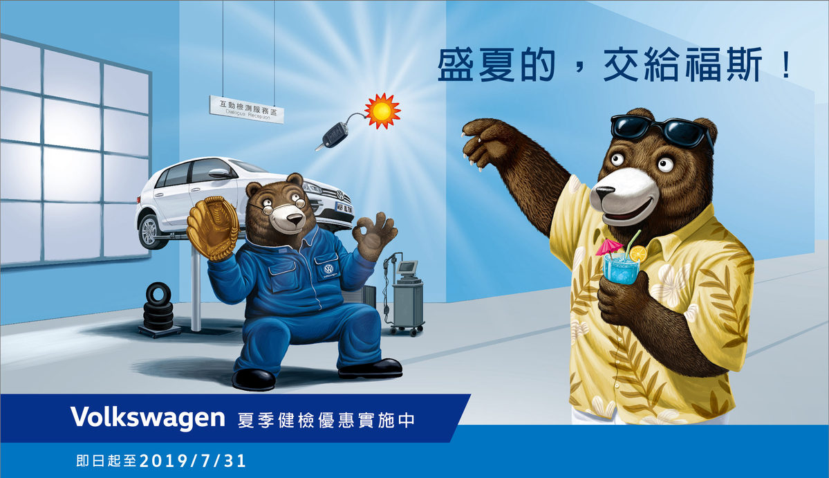 台灣福斯汽車推出「盛夏的,交給福斯!」夏季健檢優惠活動,凡於健檢期間回廠,即可享有各項專屬禮遇,包含23項免費安檢優惠、精選原廠冷氣零件85折起、原廠精品配件75折起、原廠AMG電瓶9折優惠、風箱清洗套餐優惠和購買4條輪胎即贈定位服務;如經Volkswagen官網或是Volkswagen Connect福斯智聯服務預約保養,更獨享零件保養95折優惠。