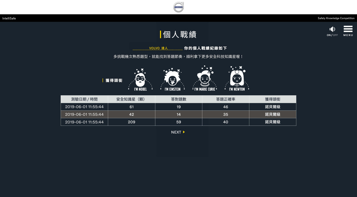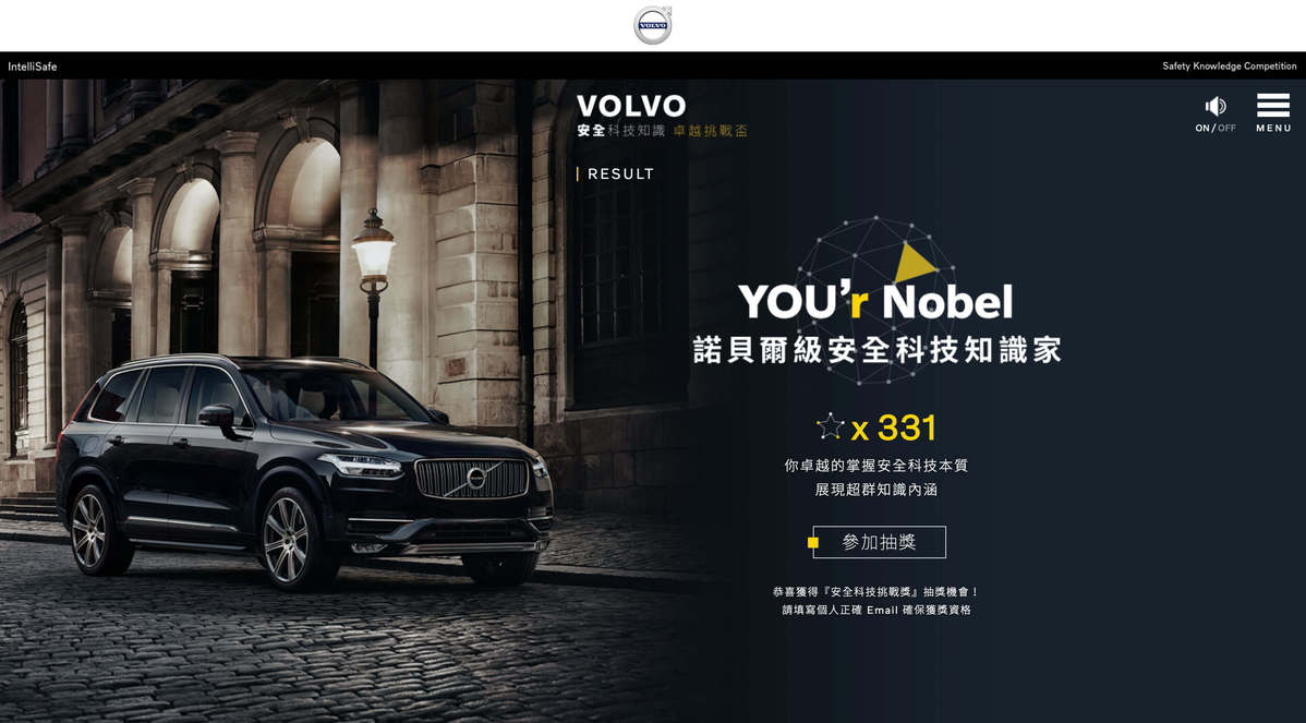 「VOLVO 安全科技知識卓越挑戰盃」限時兩分鐘,挑戰者需在 2 分鐘內快速答題,每答對一題則依「基礎」、「進階」與「深度」等不同難度獲得 1、3、5 顆「安全知識星」。答題時間到時則依所累積「安全知識星」數量作為評分依據,依得星數量依序為「諾貝爾級」、「愛因斯坦級」、「瑪麗亞‧居禮級」及「牛頓級」,所有挑戰者皆可不限次數重覆參加,每位挑戰者皆可在個人戰績頁面蒐集不同等級獎章,不只可以提高獲獎機會,更有機會在挑戰排行榜名列前茅。