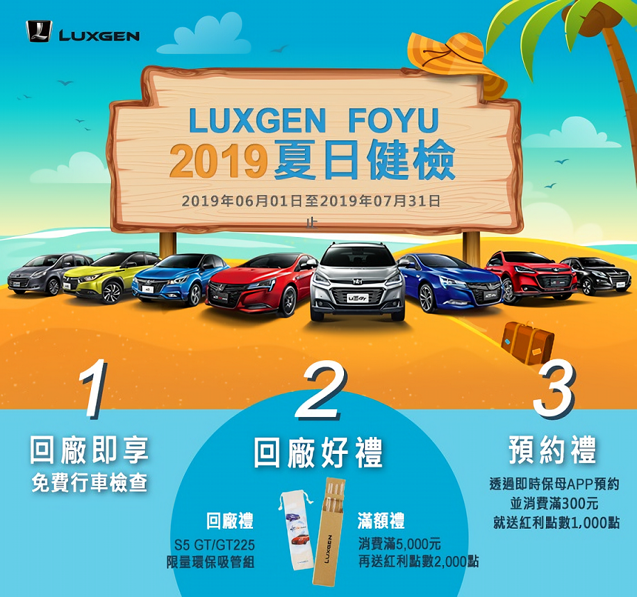 夏季時節正是全家旅遊好時機,想要玩得安心又開心,行車安全更是首要考量! LUXGEN自6月1日起至7月31日止全面啟動「2019 LUXGEN FOYU 夏日健檢」活動,預約回廠即可享有免費全車安全檢查、冷氣系統檢查、底盤安全檢查、輪胎安全檢查、前瞻科技檢查、引擎室檢查等,讓車主與家人出門旅遊皆可享受輕鬆愜意的美好時光。凡於活動期間回廠健檢,即贈送環保實用的S5 GT225環保吸管組,數量有限送完為止;單筆消費滿5,000元再加贈紅利點數2000點!LUXGEN敬邀各位車主透過『即時保母』APP預約保修,回廠履約且消費滿300元還能獲得紅利點數1000點!優先享受原廠專業健檢服務,讓車主及家人皆能感受LUXGEN最安心的全域防護與便利的用車生活!