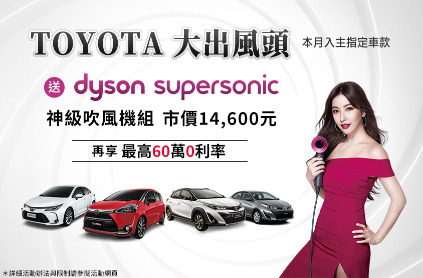 本活動之適用對象為購買TOYOTA 指定車款(ALTIS汽油、SIENTA、 VIOS、YARIS)者,可獲得dyson supersonic神級吹風機組乙組(含吹風機乙台與吹頭四個,市價新台幣14,600元)之兌換憑證乙張。贈品以實物為準,不得選色且恕不接受更換、退費或折抵現金。數量有限,送完為止。兌換方式與相關限制請參考TOYOTA官網說明。兌換後之贈品若有任何問題,請逕洽恆隆行客服中心:0800–251209詢問(周一至周五 8:00am - 8:00pm,國定假日 9:00am - 6:00pm),和泰汽車不負任何贈品瑕疵擔保責任。兌換憑證不得轉售/轉讓,如因轉售/轉讓而產生之爭議一概與和泰汽車與恆隆行公司無涉。