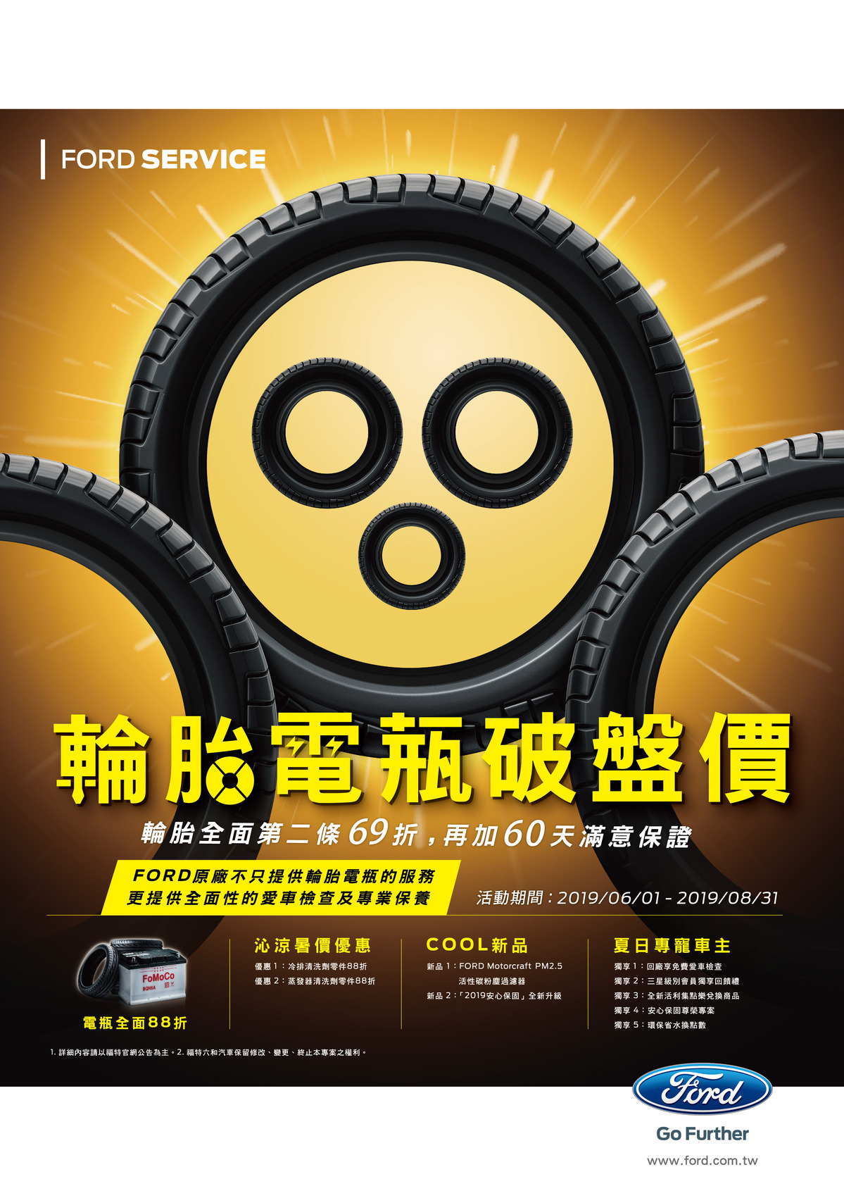 Ford專業服務廠貼心提醒,輪胎不僅影響油耗表現和乘坐舒適性,更與操控時的抓地力及排水性息息相關。凡於活動期間購買輪胎享第二條69折優惠,一次購買四條輪胎還可享60天滿意保證,並於下年度升等為「福特禮享+」三星級別會員。此外,購買Ford原廠電瓶享88折優惠,並於下年度升等為「福特禮享+」二星級別會員。更多Ford原廠優惠活動資訊如下: