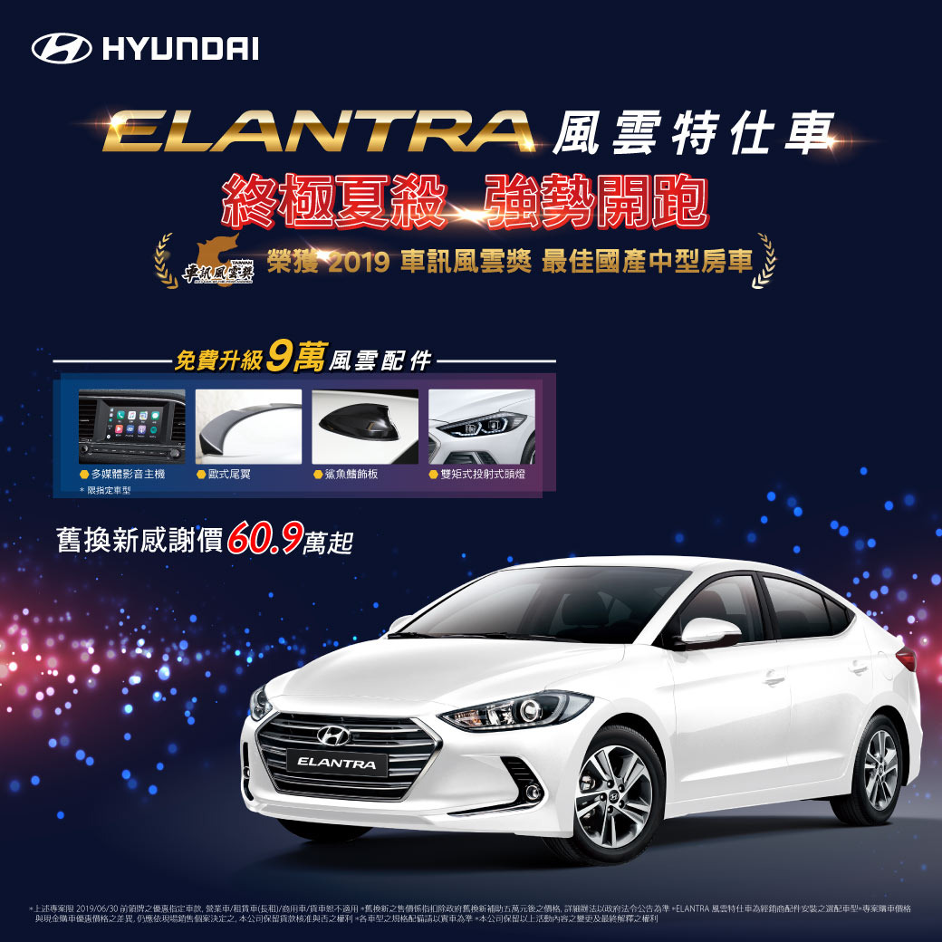 HYUNDAI ELANTRA因擁有絕佳車室空間與駕馭樂趣,深受國內買家喜愛,更在今年「車訊風雲獎」評選活動中,以外觀、內裝、動力系統、安全配備做為評選項目,歷經兩階段投票制的公正評選下,脫穎而出勇奪2019車訊風雲獎「最佳國產中型車」肯定。因此,HYUNDAI現代汽車總經銷南陽實業為了和國人一同歡慶榮耀分享,推出ELANTRA風雲特仕車,不僅享有免費升級雙矩陣式投射頭燈、鯊魚鰭飾板、歐式尾翼、多媒體影音主機等價值9萬元專屬配備,配合政府汰舊換新價ELANTRA風雲特仕車60.9萬元起(註1)。即刻入主,感受ELANTRA不凡的風雲魅力。