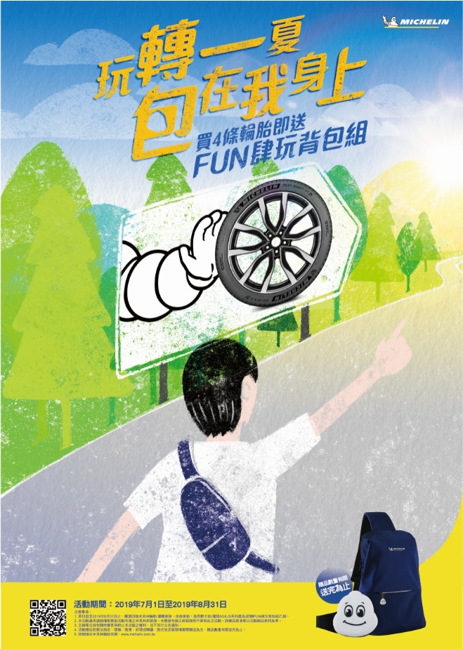「玩轉一夏,包在我身上」夏季優惠,自2019年7月1日起至2019年8月31日止,消費者於米其林指定經銷通路購買4條米其林輪胎註1.2.,即可獲贈「FUN肆玩背包組」乙組,輕鬆擁有近年來走紅於時尚男女間的單肩側背包、搭配超Q的米寶造型零錢包,街頭型男潮女回頭率大增。
