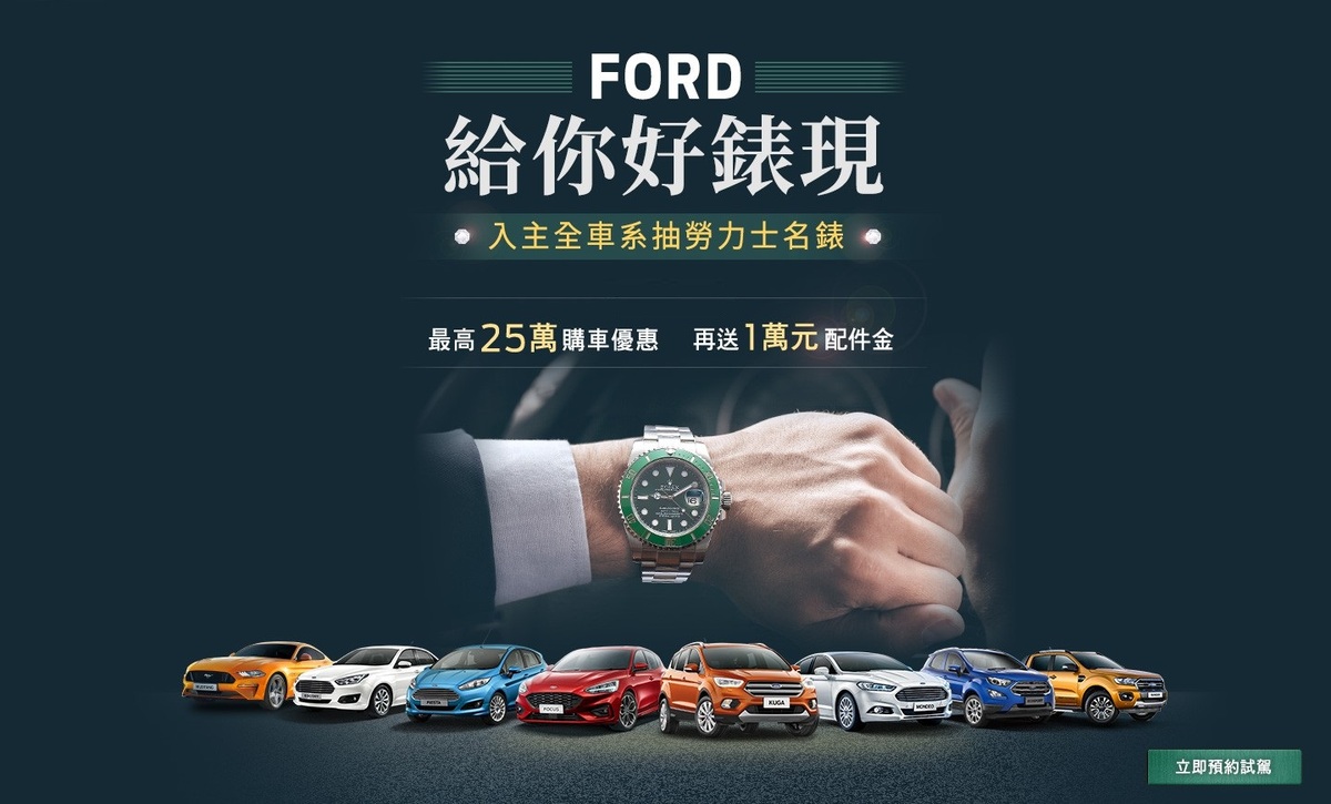 時至炎炎夏令,正是出遊好時光,Ford全方位車型陣容以先進動力、主被動安全與智慧科技、豐富多元化配備陪伴用車人每趟精彩旅程。自2019年7月1日起至7月31日止,入主Ford指定車款最高可享25萬元優惠及1萬元配件金,再抽勞力士名錶。