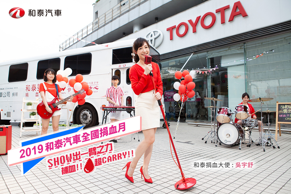 從血液基金會數據顯示,近年來30歲以下的年輕族群每年平均捐血次數最少,為鼓勵年輕人關注捐血議題並養成定期捐血的習慣,和泰汽車今年特別邀請超人氣主播吳宇舒擔任和泰汽車捐血大使,打造熱血輕搖滾的原創歌曲《SHOW出一臂之力,補血超CARRY!》,講述不管什麼血型,只要願意SHOW出一臂之力,就能CARRY幫助有需要的人,藉由歌詞傳遞滿滿正能量,吳宇舒也突破以往主播印象,首次擔任主唱與MV主角,用清新嗓音詮釋捐血的意義,並拍攝青春勵志的音樂MV,讓人一聽就上癮!平時熱心公益的吳宇舒表示很高興能參與公益影片的拍攝,也希望藉此機會鼓勵大家挽袖捐血,幫助他人,人人都是熱血英雄,且捐血還能促進血液代謝,有益身體健康。