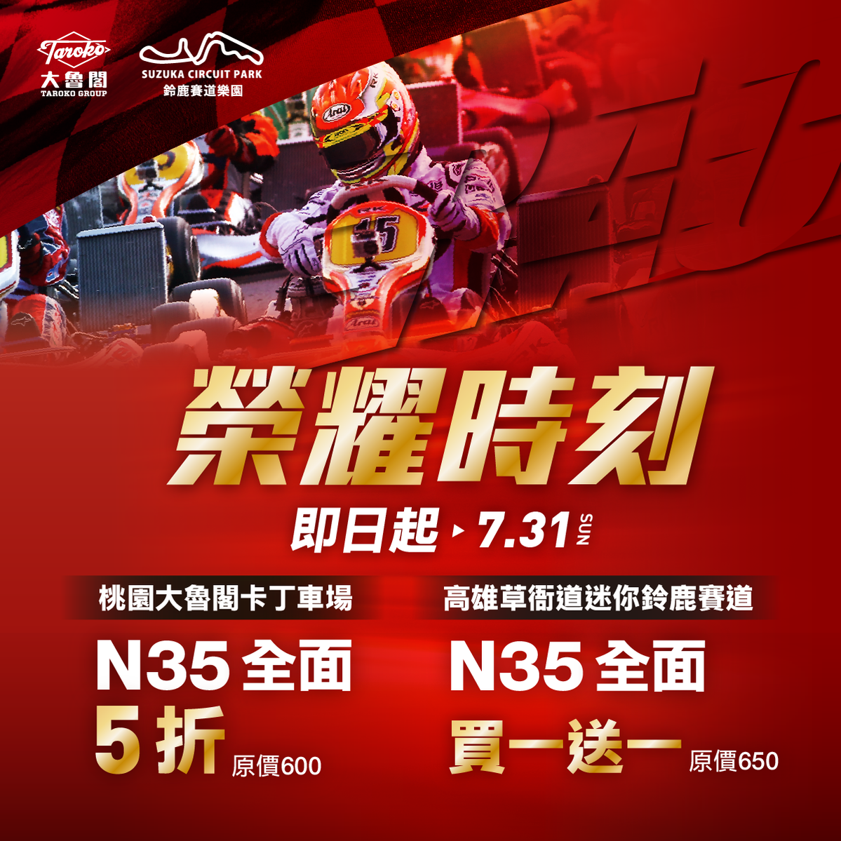 即日起至2019年7月31日,Honda Taiwan與大魯閣集團聯手邀約Honda 汽、機車車主,前往「桃園大魯閣卡丁車場」或「高雄大魯閣草衙道鈴鹿賽道樂園」參加賽道競速奔馳之旅,凡於活動期間出示Honda汽、機車車主鑰匙,即可以優惠價格享有「桃園大魯閣卡丁車場/N35 卡丁車/不限場次/半價(原價600元)」或「高雄大魯閣草衙道鈴鹿賽道樂園/N35 卡丁車/不限場次/買一送一(原價650元)」之超值方案。