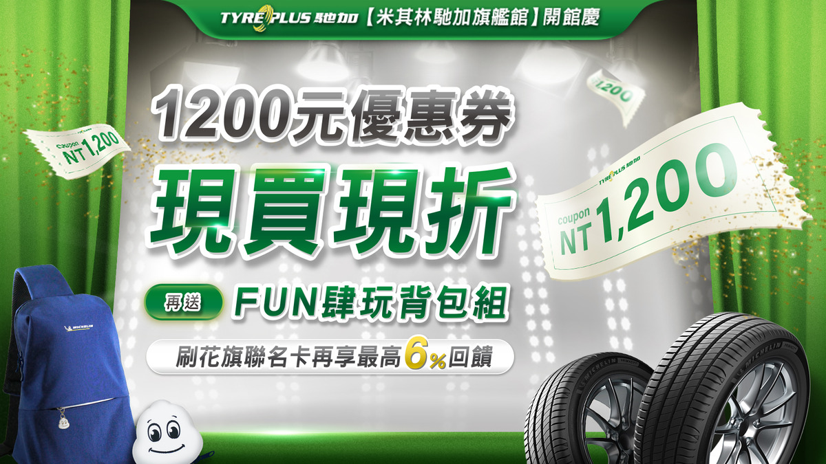 為提供消費者更快速、便捷、多元的購物管道,輕鬆享有高品質的米其林產品、與優質的馳加通路服務,台灣米其林與電商領導品牌PChome線上購物攜手成立台灣第一個輪胎品牌線上旗艦店-「米其林馳加旗艦館」。自5月底試營運以來,獲得眾多消費者真切回響,除讚賞購物便利性、原廠輪胎品質令人大感放心之外,獨有的線上預約安裝服務更節省了四處尋覓保修廠的時間,不僅技術專業、高效快速,更是免費服務,堪稱忙碌現代人的聰明好幫手!今日,台灣米其林宣布「米其林馳加旗艦館」7月12日正式開館!即日起至7月25日開館慶期間,線上購買任一款米其林輪胎產品並領取折價券,即可享受PChome提供限時現折1200元的購胎優惠,刷花旗信用卡再享最高6%回饋*,還能把Fun肆玩背包組帶回家!讓安全馳騁的夢想,輕鬆實現於指尖。