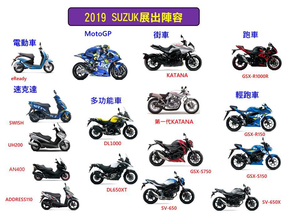 超過15種車款將在SUZUKI展區陳列展示,包含公升級超級跑車之王GSX-R1000R、傳奇機種第一代KATANA與2019年全新KATANA,中量級街跑車GSX-S750、雙缸V-TWIN SV650與雙生車型Cafe Racer SV650X,多功能機種V-STROM 650/1000,中排量優雅動感大羊BURGMAN 400與最強小排量休旅速克達 BURGMAN200,都會遊俠惡路也不怕的ADDRESS 110,白牌輕檔車王者GSX-R150/S150,及承襲R1000/BURGMAN400 DNA的Swish 125,與剛剛發表的eReady 電動車,都將在SUZUKI展區展現最強Power!