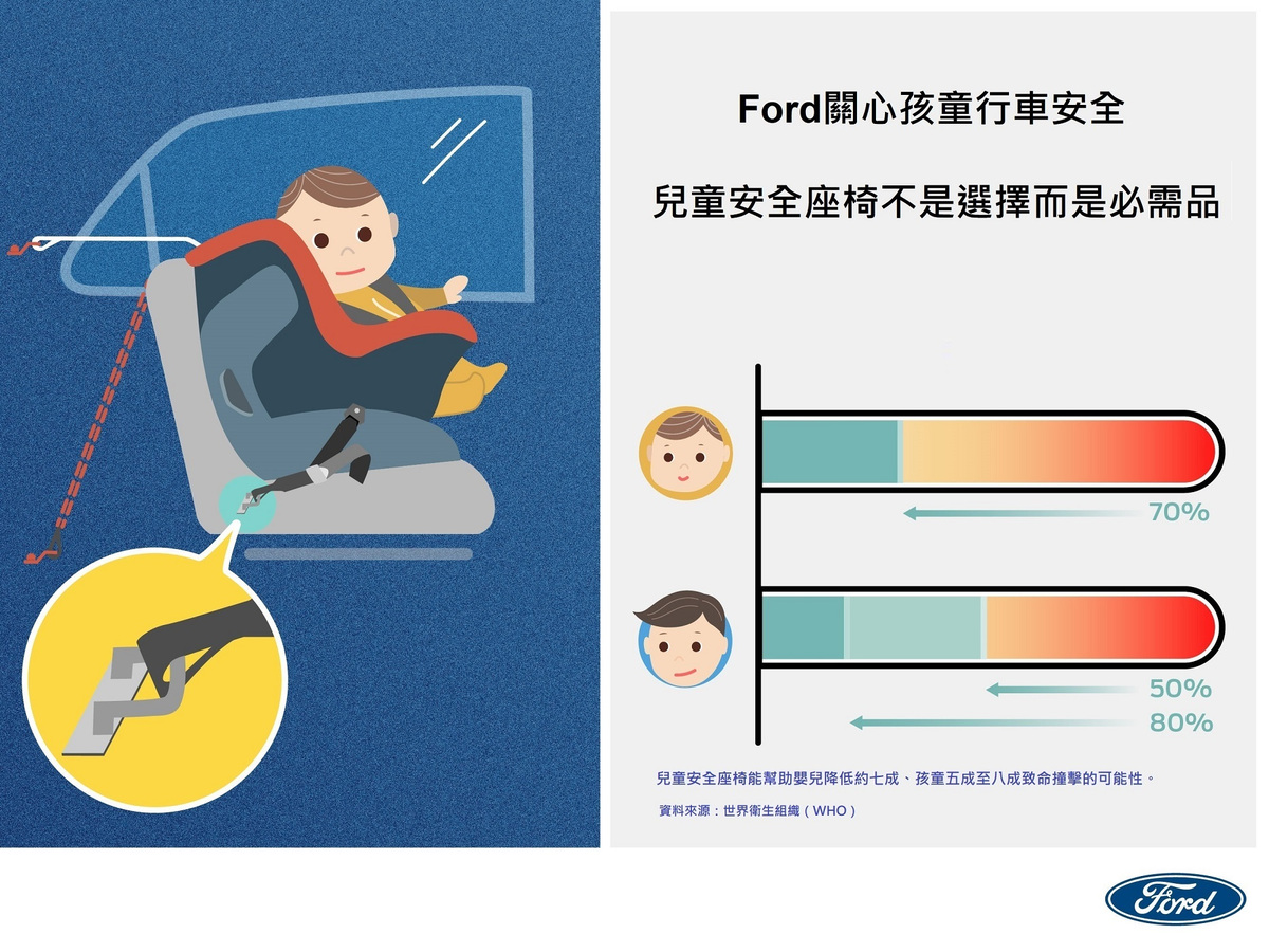 Ford 車輛皆配備有符合規定之兒童安全座椅固定系統(ISOFIX),其中規範新車的座椅椅面需設有兩個下部固定器,並包含防止兒童安全座椅向前翻覆的上部固定器,讓民眾能夠正確並快速安裝兒童安全座椅,即便如此,家長還是得確認安全座椅是否有確實固定在座椅的上下固定器上,也必須注意同一張安全座椅是否適用於其他可能乘坐的車輛。若經銷商有提供安裝服務,可善加利用,或也可以請教專業人士,確認安全座椅是否安裝正確。全世界兒童安全座椅安裝錯誤的事件頻傳,即使是資訊發達的國家,例如美國就有95%的兒童安全座椅發生至少一項嚴重的安裝錯誤。