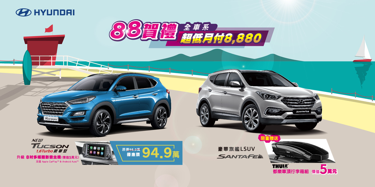 歡慶屬於爸爸們的季節,HYUNDAI現代汽車為了讓全台消費者能無壓力入手旗下熱銷車款,推出「88賀禮」購車優惠專案,全車系享超低月付8,880元讓你輕鬆有感的把HYUNDAI汽車開回家,且入主指定車款TUCSON與SANTA FE,另有專屬好禮配備一起帶著走。還在讓家人汗流浹背的度過艷陽高照的盛夏嗎?快點開著HYUNDAI現代汽車載著家人一塊輕鬆共度屬於這個夏天的熱情父親節吧!