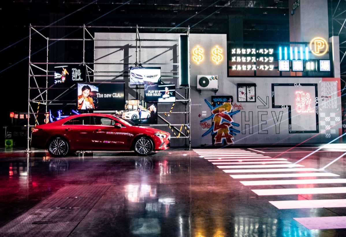 發表會現場,竟然只是一個修車廠?! 警示線纏繞著入口加上嚴密的保全,仿佛重大事件在裡面發生,這竟是台灣賓士所設下的入口結界,等到一切就緒,與會貴賓們準備登入 CLA 的異度空間,這是一個以 1:1 打造的真實街景:各式各樣的霓虹廣告看板、停車場、小酒吧、遊戲間及潮流服飾店,甚至是多樣化的街頭小吃攤販,唯一不同的是,這是一個由 A.I. 人工智慧主宰的城市,利用動態補捉技術,將主持人虛擬化投影在 LED 螢幕上,猶如一個生動的人形廣告看板,這位虛擬主持人大有來頭,是由 Mercedes-Benz 進階多媒體系統 MBUX 所扮演,她有條不紊的引導大家使用手上的代幣兌換飲料及食物,甚至可以投販賣機、遊戲機。時間一到,遊戲主機正式啟動,化身為城市主人的台灣賓士總裁高明漢先生 Michael Grewe 透過 LED 投射影像,歡迎所有玩家登入遊戲並介紹今天的主角 The new CLA 200 率先出場,全新的超殺物種正式亮相。