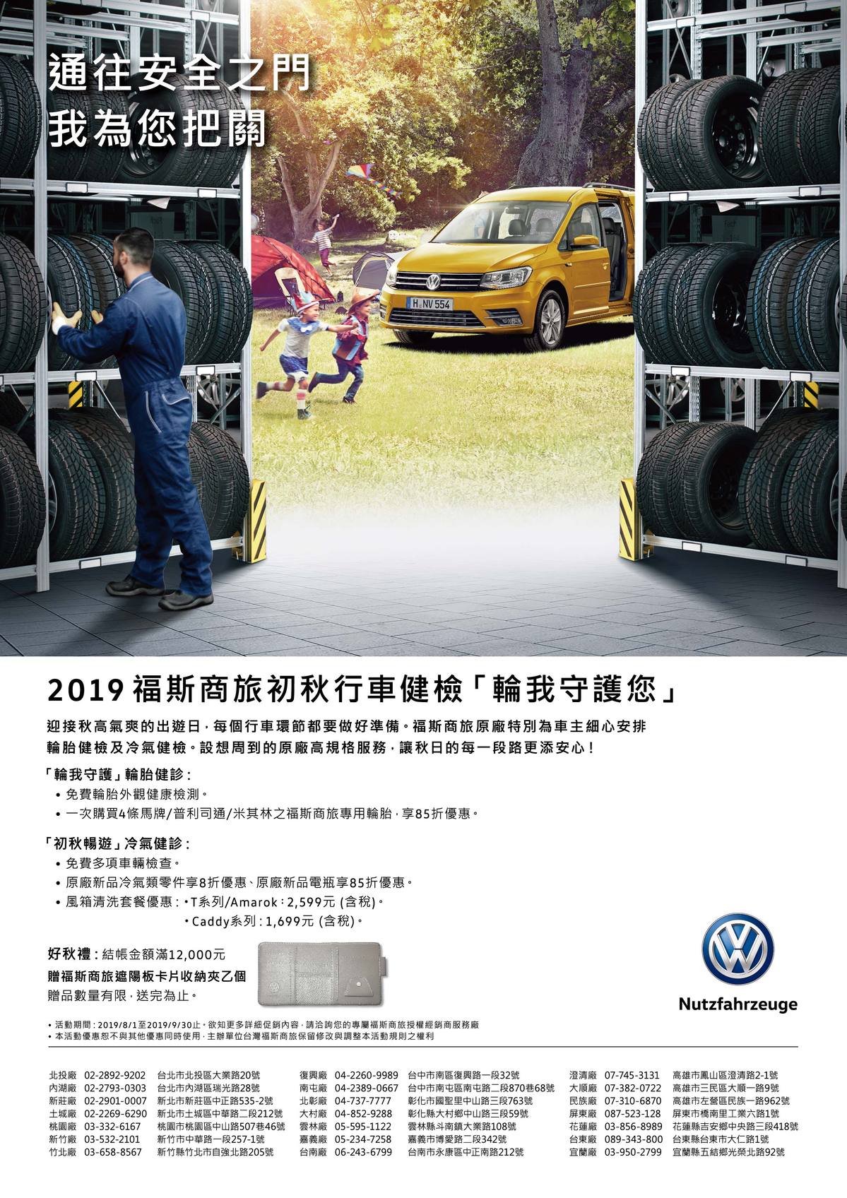 秋高氣爽、天氣穩定的秋季,是一年四季中最適合出遊的季節。快樂出遊,更重要的旅途中的平安,唯有確保每一個行車環節的安全無虞,才能開心出遊,平安回家。自2019年8月1日至9月30日止,台灣福斯商旅特地舉行「輪我守護您」秋季健檢活動,提供輪胎與冷氣相關的車輛健檢,並提供相關的零件優惠,以高規格的原廠守護,許一個美麗秋日。