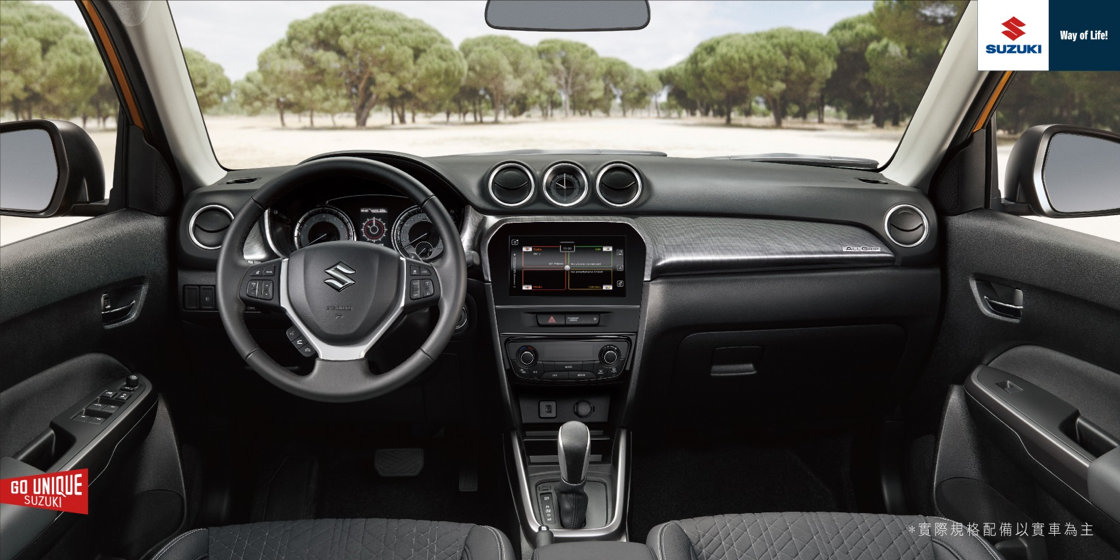 THE NEW VITARA的新一代內裝設計,更持續精進,帶來驚喜。整體車室以黑色為主要基調,輔以畫龍點睛的銀色點綴,延續著THE NEW VITARA一貫沉穩的布局,呈現洗鍊的質感風格。而在內裝質感美學的深化之外,更導入多樣全新配置:全車系儀錶板新增4.2吋全彩整合式多功能型車資訊顯示幕,所有行車資訊,一手掌握、一目了然。另可選配多功能觸控式螢幕,讓科技與智能應用隨行,便利生活與時俱進。