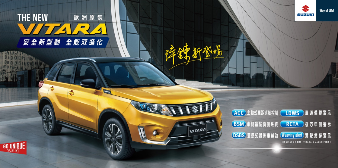 榮獲2017年最受歡迎小型車品牌的SUZUKI ,在5月中旬 ALL NEW Jimny上市,引起銷售熱潮、廣受各界矚目之後,繼續為廣大的台灣消費者,帶來另一個重磅消息:旗艦車款 THE NEW VITARA 改款上市。身為小型SUV領導者的VITARA,有著30年車系發展歷史的沉厚底蘊,而新一代VITARA,更持續在進化淬煉的道路上前進!THE NEW VITARA延續靈巧行動派的魅力,以小排氣量大動力的優異動力、傲視同級的節能油耗表現、並在原本完整豐富的主被動安全配備上,再新增導入6大安全系統,透過技術的進步和對未來的遠見,一次又一次蛻變成更完美的車,在演進的路上,持續大步邁進;而除了內在安全本質的全面提升,THE NEW VITARA更在外型上,帶來耳目一新的美學設計。全新設計的鍍鉻直柵水箱護罩,加上全車LED 燈組以及2款TWO TONE車色–金黃黑和灰藍黑的引進,絕美外型加上跑格動力,輔以主動安全系統的進化齊備,由歐洲原裝進口的全能實力型SUV - THE NEW VITARA,以安全型動新浪潮的思維,再次帶來淬鍊進化的見證。