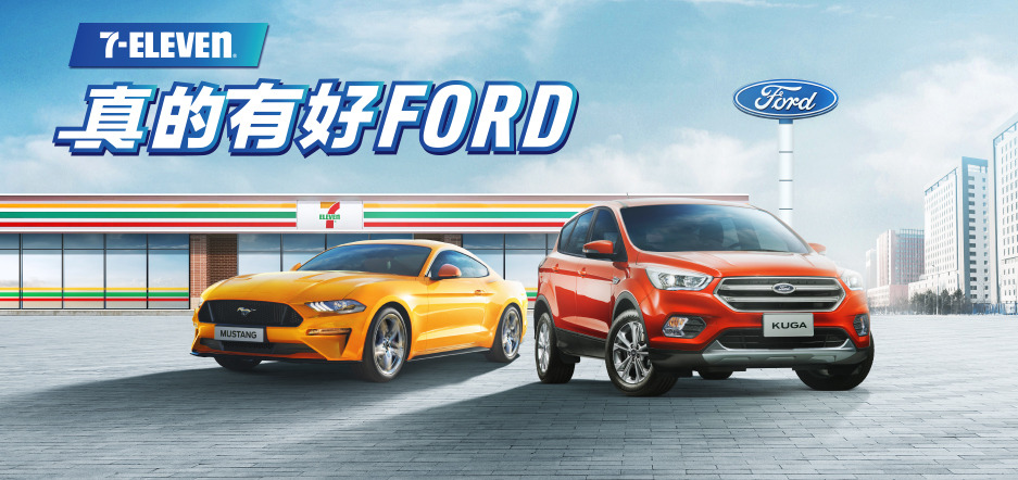 繼與美式賣場成功的合作經驗後,Ford攜手與超商霸主7-ELEVEN進行創新的跨界合作,推出「7-ELEVEN真的有好FORD」專案,首創進駐便利超商展示車輛,並推出Ford Kuga EcoBoost®182全民便利型首賣活動,全台門市全天24小時隨時提供指定合作車款優惠資訊,成為最便利的購車諮詢平台。即日起至9月30日止,消費者經由全台5,500家7-ELEVEN門市人員推薦,上網登錄資料並訂購專案活動限定車型Ford Kuga EcoBoost®182全民便利型或美式經典跑車Ford Mustang 2.3L EcoBoost® Premium型,將可獲得7-ELEVEN禮券3,000元。而兩大車款也將於9月1日在台中、9月8日在台北,及9月22日在高雄7-ELEVEN門市展出,為廣大車迷與消費者帶來創新又便利的賞車體驗。