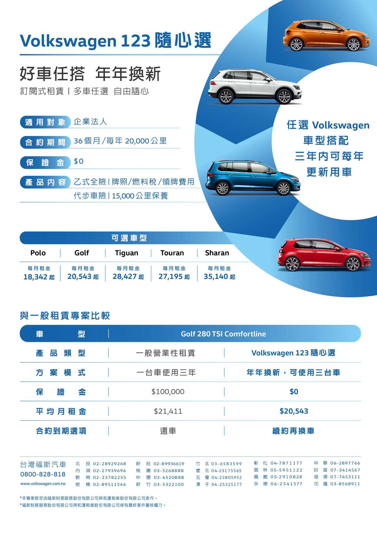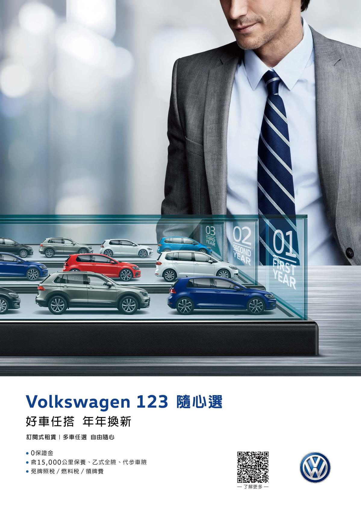 為協助台灣企業節省經營成本、提升公司品牌形象和用車效率,台灣福斯汽車引進歐美盛行的訂閱式租賃服務概念,推出「Volkswagen 123隨心選」企業方案,顧客於三年合約期間每年皆可更換Volkswagen新車,同時別有於日系品牌,領先業界首創三年租期免保證金,大幅減輕車輛保証金支出,資金運用靈活無負擔,同時享有更優質便捷、更經濟實惠的租賃服務。