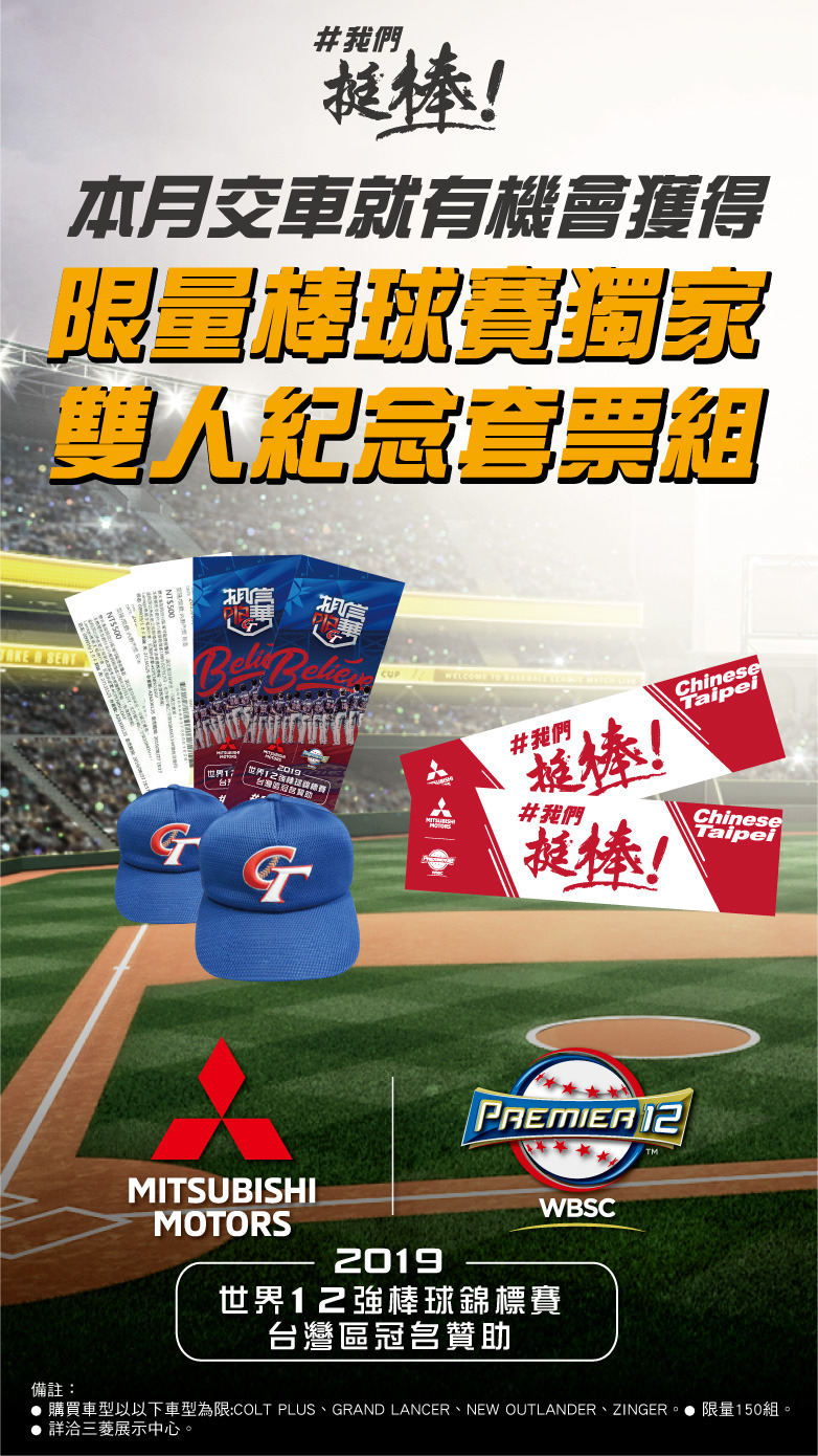 「2019第二屆世界12強棒球錦標賽-售票記者會」今日於MITSUBISHI MOTORS濱江展示中心舉行,除了售票資訊與紀念商品正式亮相,也首度公開全新的中華隊應援曲。台灣區冠名贊助商MITSUBISHI MOTORS力挺賽事,為喜愛棒球的廣大球迷與車主們獻上獨家好禮,凡於9月30日前購買COLT PLUS、GRAND LANCER、NEW OUTLANDER、ZINGER任一車款,即有機會抽中「2019世界12強棒球賽應援好禮」,獎項包含中華隊紀念球衣、球帽等,最大獎可獲得價值7,200元【獨家雙人紀念套票組】!