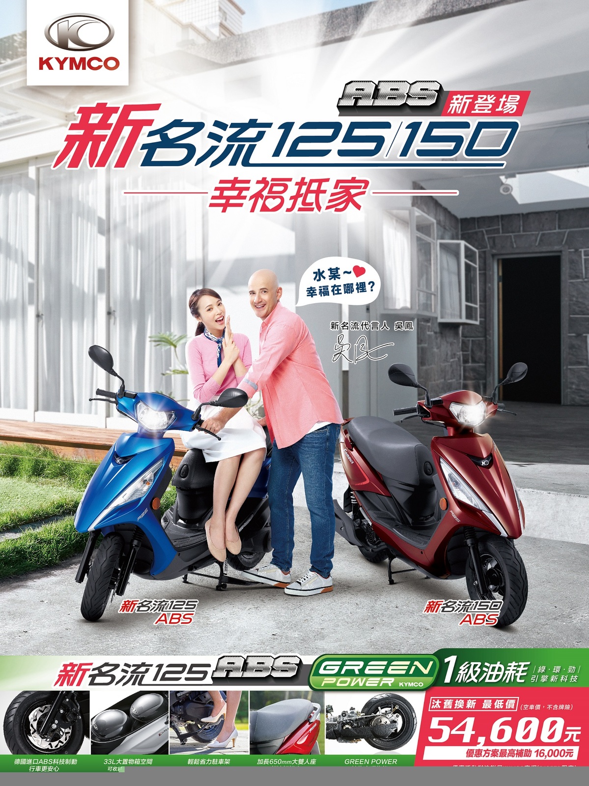 說起這台年初一推出就廣受好評的KYMCO新名流車系,吳鳳立馬化身機車達人熱情分享,除了採用「一級油耗Green Power引擎系統」的新環保機車更友善環境,愛老婆的他更是大大稱讚「輕鬆省力駐腳架」、「33L超大置物箱」,另外,有一雙可愛女兒的吳鳳十分讚賞此次廣告中騎乘的新名流125ABS版,讓當了爸爸後對家人安全更謹慎的他多了一份安全感,現在逢人就當起銷售員熱情推銷。目前KYMCO 新名流車系包含:新名流125、新名流125 ABS、新名流150、新名流150 ABS,搭配廣告上線時間,即日起至9月30日止,消費者購買KYMCO新名流125ABS並完成領牌者,購車加碼贈7,200元購車金,最高享16,000元汰舊換新補助 (購車金7,200元+政府125cc ABS購車補助4,000元+政府汰舊換新補助4,800元),最低幸福價只要54,600元,更有新名流150、新名流150 ABS加大馬力新登場!