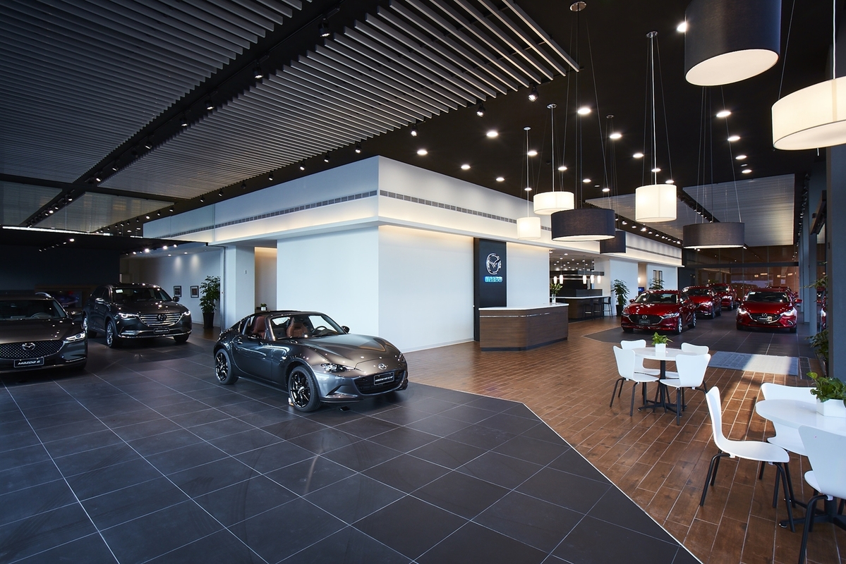 南台中旗艦據點的展示間採「花道」為設計主軸,並透過刻意安排的燈光照明角度,讓10台展示車呈現猶如藝品般的姿態。客休室設置於L形狀展車區域的內側,從中庭引進柔和自然日照,營造溫暖宜人的氛圍。寬敞舒適的客休室加上面積達1200坪且擁有30個工位的專業服務廠,創造極大規模的維修保養能量。此外,南台中旗艦據點特別打造了3間交車室,藉由精緻質感的元素以及細膩貼心的服務品質,使所有MAZDA新車主都能夠與品牌建立情感的連結。