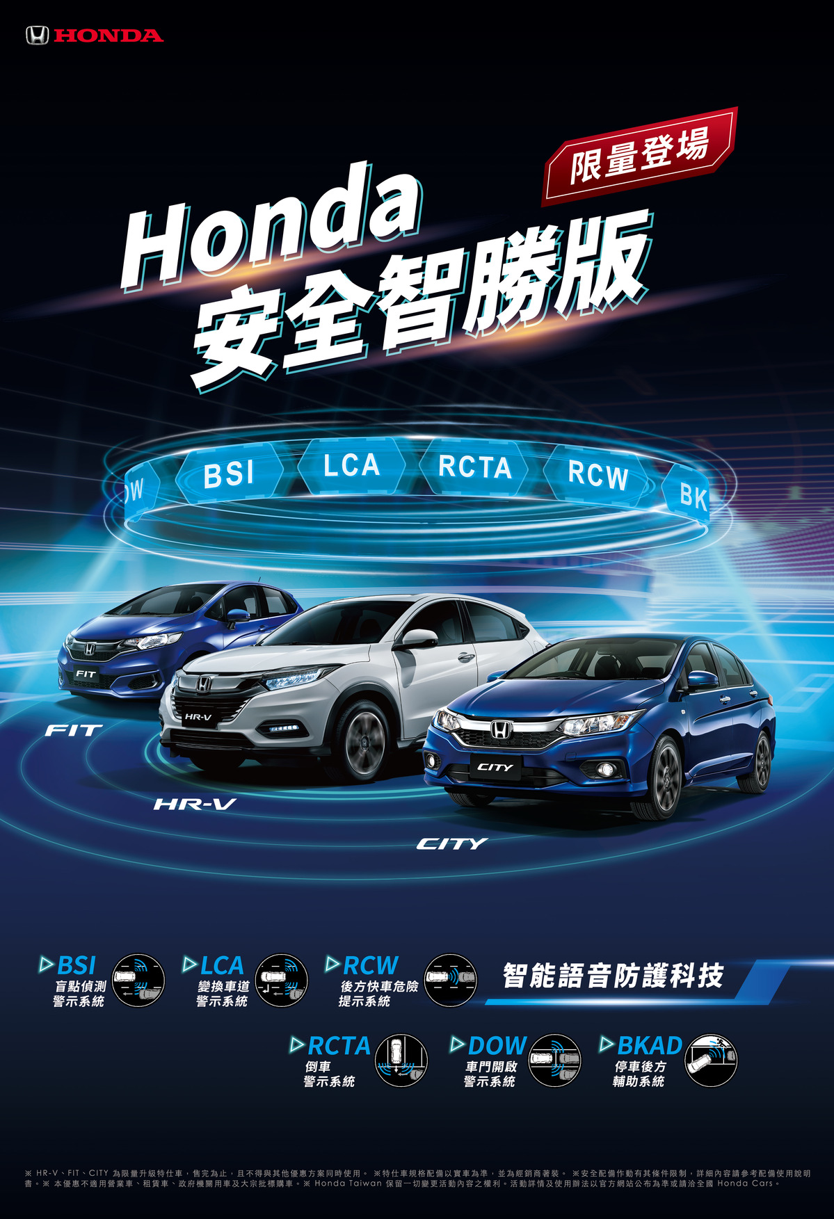 Honda Taiwan在10月以極智安全思維,導入最先進的智慧安全感測元件技術,將全新開發六項盲區智慧語音防護系統,裝載於Honda全新推出之「Honda安全智勝版」特仕車、並搭載於旗下暢銷車款「HR-V」、「FIT」「CITY」,以智慧科技守護安全幸福旅程。