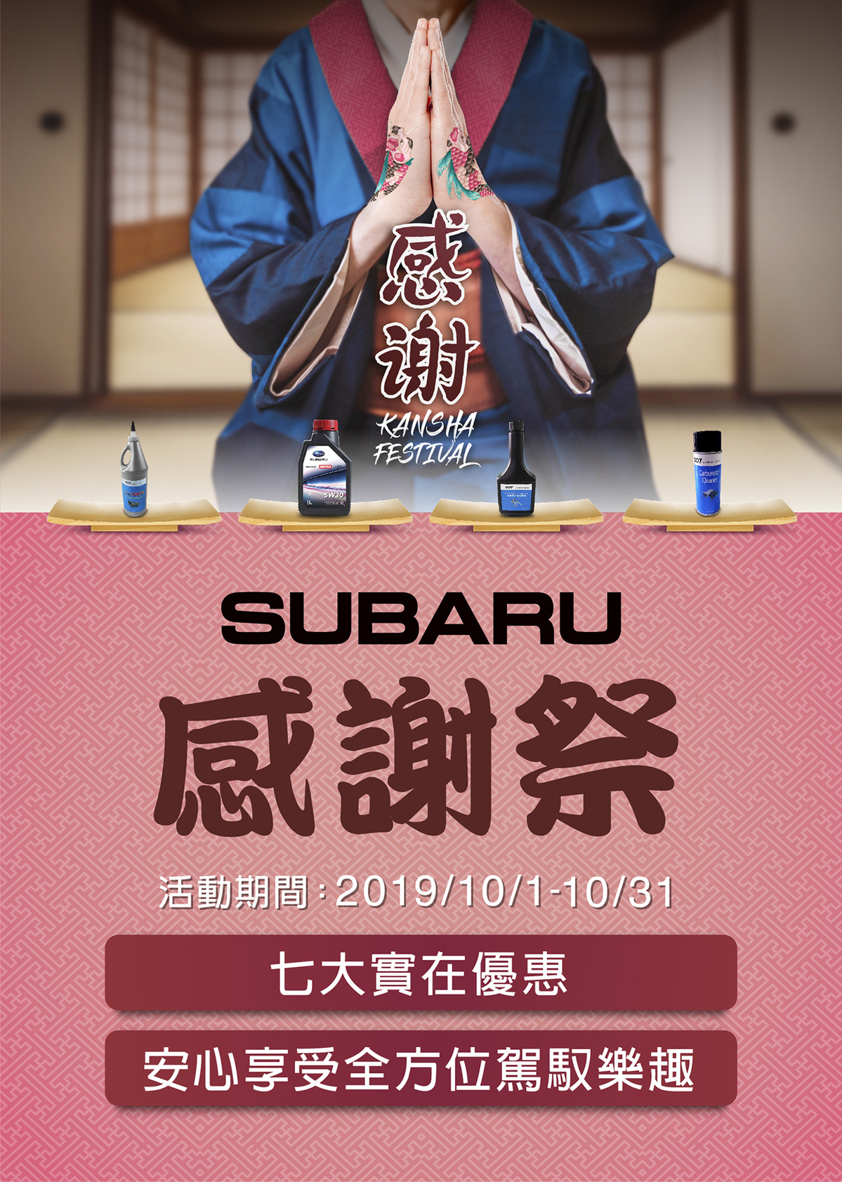 SUBARU台灣意美汽車感謝每一位車主長期支持品牌「安全至上」的造車理念,特別於10月1日起至10月31日止,精心規劃SUBARU感謝祭活動,透過七大實在優惠回饋車主,以豐富的優惠內容,協助將您的愛車提升至最佳狀態,更提供延長保固方案,讓車主安心享受SUBARU品牌全方位駕馭樂趣。