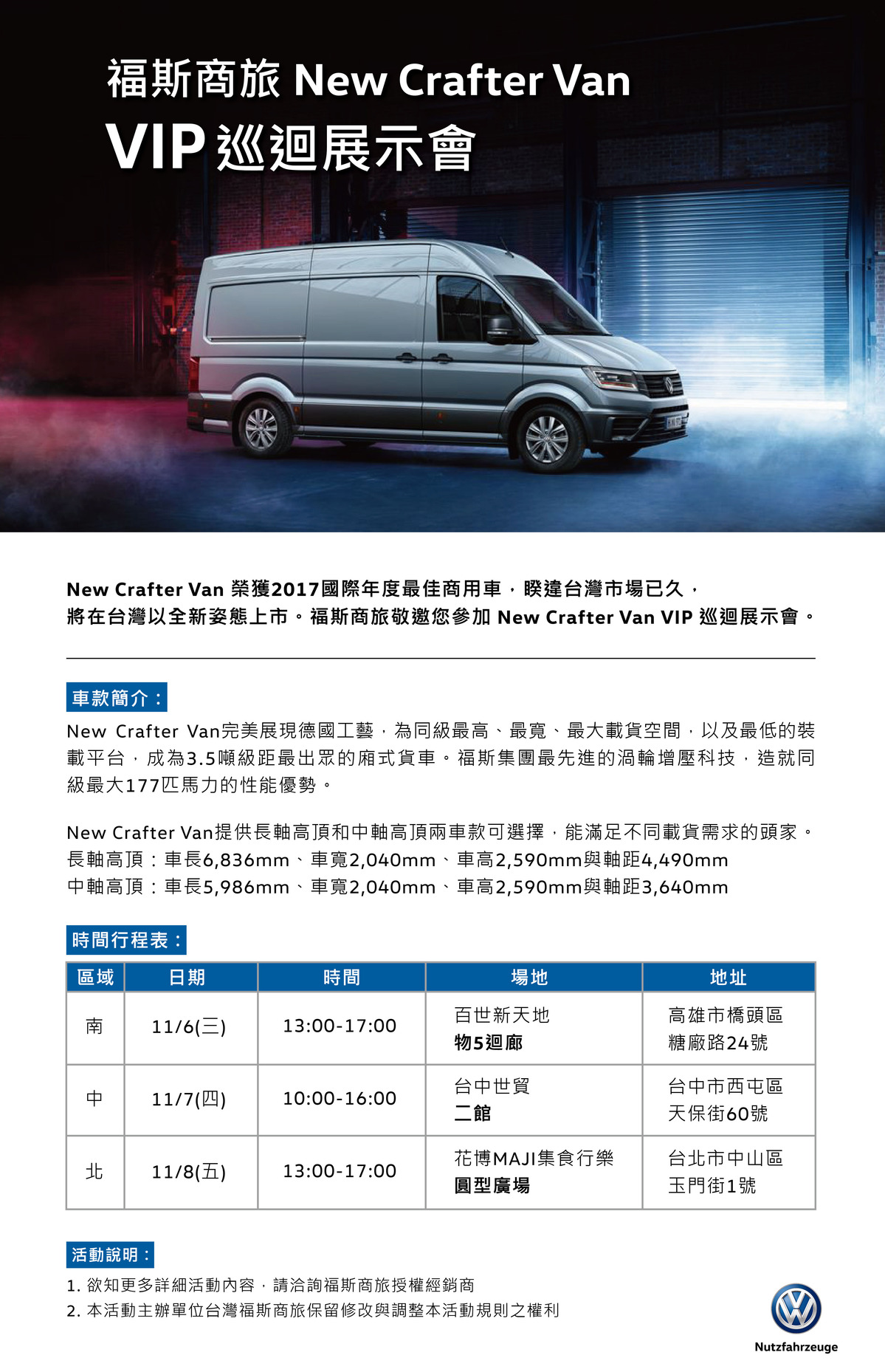 獲得2017年國際商年度最佳商用車肯定的New Crafter Van,在2019年商業車博覽會以新世代長軸高頂車型為先鋒,首度在台灣市場亮相以來,即受到商用車業主的關注。為滿足買家的期待,台灣福斯商旅,自11月6日開始,以高雄百世新天地文創園區為起點,巡迴台中世貿中心與台北花博MAJI集食行樂圓型廣場等,舉辦New Crafter Van VIP巡迴展示會,除了先一步亮相的長軸高頂車型,中軸高頂車型也同場亮相,宣告New Crafter Van家族全員到齊。