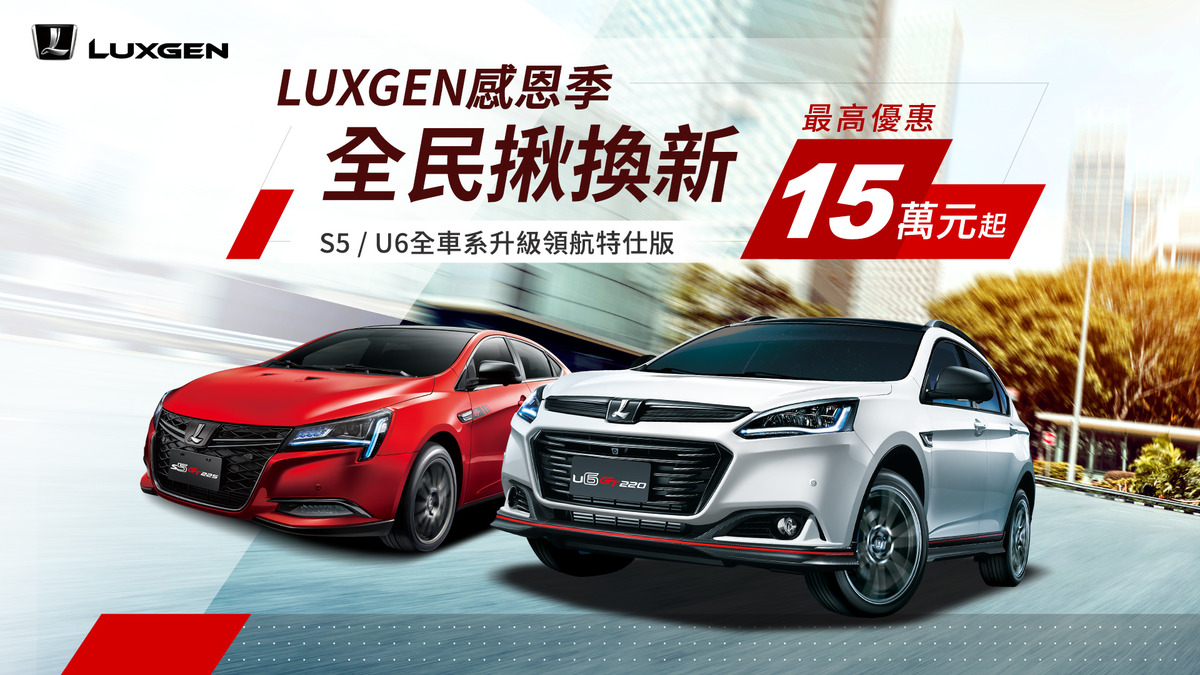 LUXGEN為台灣唯一自主品牌,不斷聆聽消費者需求,持續打造最優秀的產品以及最貼心的優惠方案,努力深耕台灣外,廣大消費者的支持與愛護也是促進品牌進步的絕對動力,本月為感謝喜愛LUXGEN的車迷朋友們,推出「全民揪換新」優惠專案(1):凡於11/1(二)至11/29(五)止,入主LUXGEN U6 GT、S5 GT車系,即享價值5萬元起領航特仕升級、歡心購車金5萬元、舊換新再享5萬元(2),優惠最高15萬元起,另外專案還提供萬元紅利金,再享全車5年或14萬公里保固升級(3),交車再送6年6大系統及前瞻系統不限里程延長(4)!敬邀喜愛LUXGEN的準車主們切莫錯過此波購車良機,讓您的夢想成真!