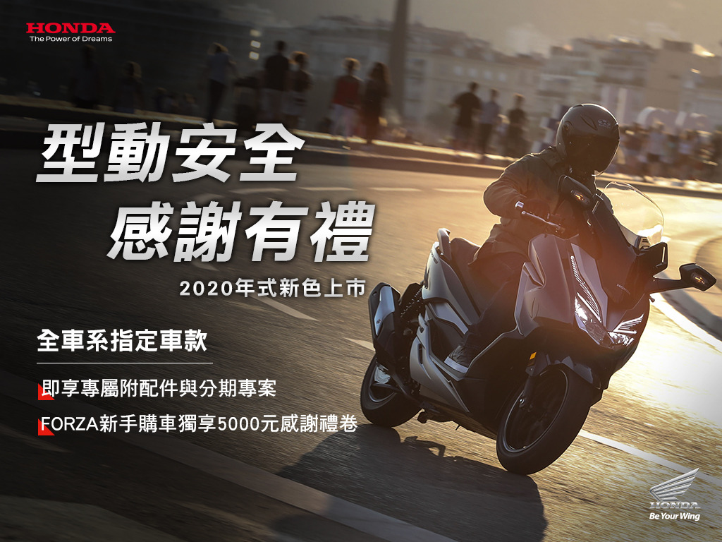 為了感謝Honda Motorcycle車主們持續對於Honda Taiwan的鼓勵與支持,Honda Taiwan也將陸續導入2020年式的全新車色機種,本月更為大型二輪的初心者提供專屬2020 FORZA新手購車專案,將與騎士一同於城市遨遊,展現Honda二輪獨有的移動美學。除此之外,延續上月「旅夏」主題的高人氣專案,本月同樣在GOLDWING、X-ADV、CRF1000L Africa Twin以及新款CB110RS/EX系列等指定2019車款,凡於本月完成領牌車主,可享36到40期零利率分期方案或是專屬附配件加購案,讓您輕鬆無負擔,快到 Honda Motorcycle 全台經銷據點一賞大型重型機車的光采!