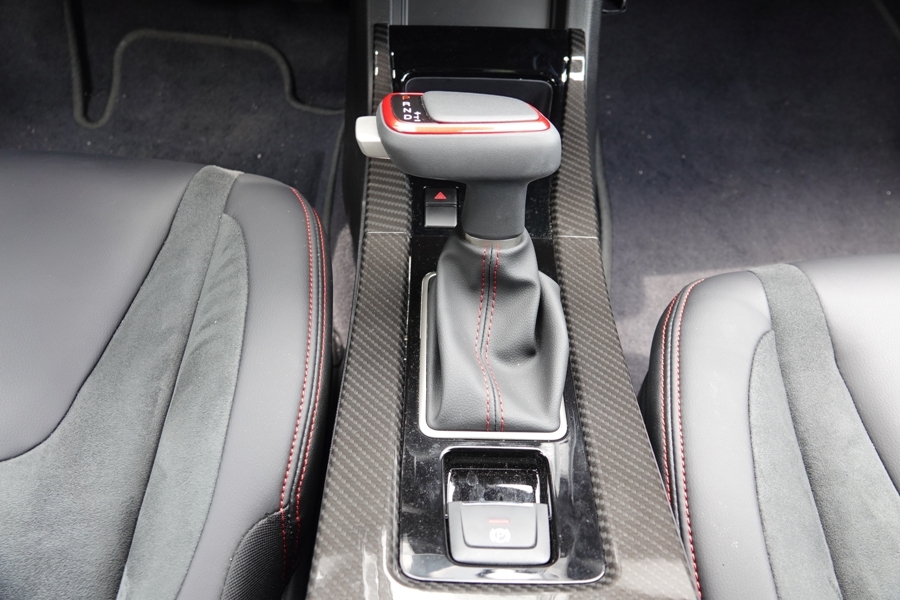 走進內裝,高張力性能格局讓我們雙眼為之一亮。車內座椅與飾板以黑色為基底,並在多處採用紅色縫線與紅色飾板,再加上運動化皮質方向盤、麂皮門飾及類碳纖維紋路飾板,增添不少熱血氛圍。再來,全車座椅使用包覆性與止滑性出色的類麂皮材質,無論激烈操駕還是長途乘坐,身體都不易疲累。