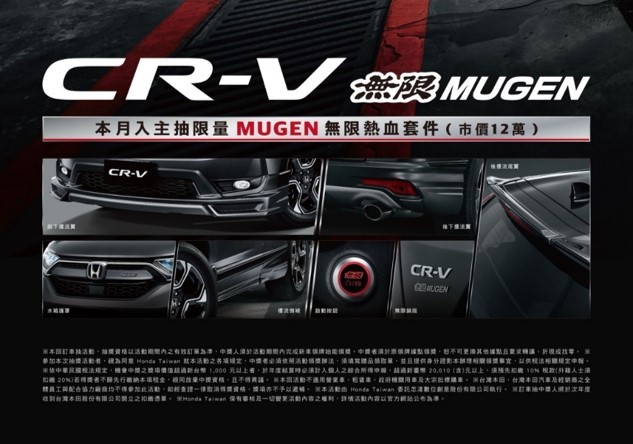 ※CR-V MUGEN優惠方案限本月領牌適用,並不得與其他購車優惠同時使用。