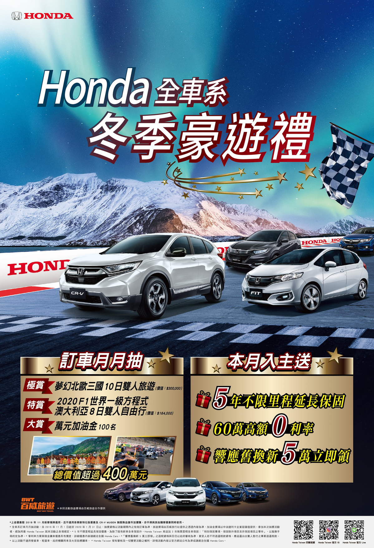 即日起,全國Honda Cars同步啟動,凡活動期間內訂車,即享有「夢幻北歐三國10日雙人旅遊」、「2020 F1世界一級方程式澳大利亞8日雙人自由行」及「1萬元加油金100名」的月月抽活動,本月入主再享有五年不限里程延長保固及60萬高額0利率的購車優惠,讓大家輕鬆又安心的買新車過新年。此外,Honda響應政府舊換新補助,凡符合資格者,還享有5萬元立即領。Honda提供消費者多重購車優惠,敬請把握年前優惠良機。