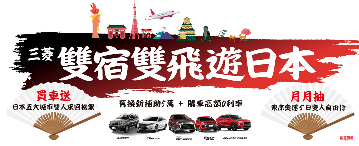 中華三菱本月推出『雙宿雙飛遊日本』一人購車兩人出國享好康!凡本月底前購買(需完成訂車且領牌) COLT PLUS、OUTLANDER、GRAND LANCER、ZINGER、ECLIPSE CROSS、PAJERO任一車種即可獲得日本五大城市雙人來回機票,並可參加月月抽日本東京奧運5日雙人自由行,給消費者最大的購車驚喜!另外,COLT PLUS在本月推出2020年式,主動安全全面升級,舊換新限時優惠44.9萬起;購買GRAND LANCER旗艦型並於月底前領牌,即贈送市價12,000元【勁黑擾流尾翼】及【LED內門檻踏板+車室氣氛燈】的動感配件組;ECLIPSE CROSS提供圓夢入主方案享【※舊換新11萬元限時回饋、5年或15萬公里保固、80萬60期低利貸款或首年低月付8800元】三大優惠,讓消費者購車無需等待。