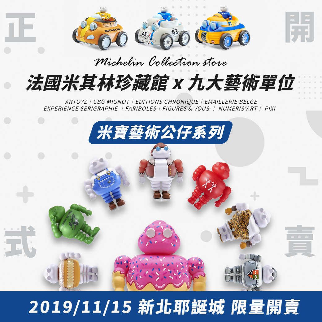 今年聖誕節,對公仔控來說有福了。「米其林聖誕貨櫃」今年於新北耶誕城盛大開幕,獨家販售11款全球限量米寶公仔蒐藏系列(Bibendum collection) 註1,是由長於將動漫角色設計製作成公仔的法國知名造型品牌Fariboles Productions註2設計,米寶公仔系列每一款全球限量500隻、米其林小車系列全球更只有100隻,台灣則各爭取到100與30隻,讓全台公仔蒐藏者興奮不已。從布雷斯特泡芙米寶、拳擊手米寶、甜甜圈米寶、飛行員米寶、騎士米寶、工匠米寶、紅色指南米寶、綠色指南米寶,每個公仔背後都有一段具有歷史意義的小故事,更有超限量版的「米寶卡丁車」、「米寶探索號」與「米寶復古號」公仔,設計經典,也都富含著米其林輪胎發展史上的特殊意義(附註於文後),因此,米寶公仔,絕對是公仔迷不能遺漏的收藏品之一。