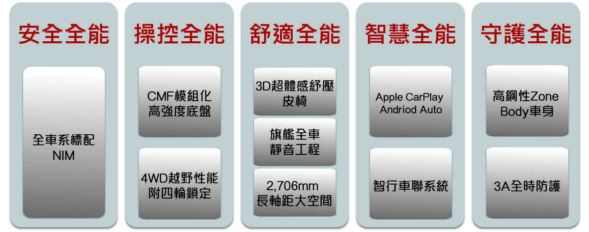 NISSAN以高強度Zone Body車身鋼材打造X-TRAIL車身結構、標配全車6顆安全輔助氣囊、3A主動全時防護系統,由情報安全、主動安全到被動安全提供駕駛者與乘客最安心的全方位防護。