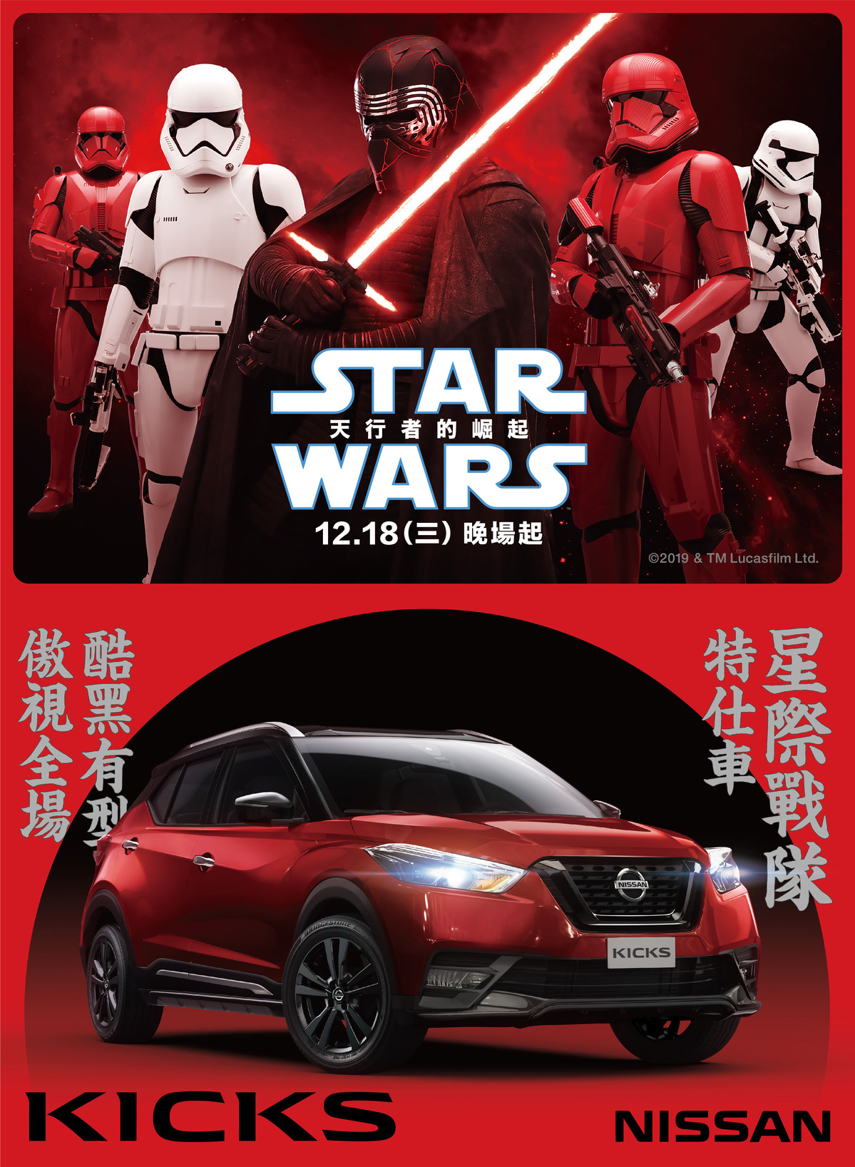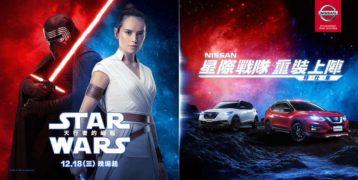 影迷引頸期盼的【STAR WARS:天行者的崛起】電影12月18日晚場起即將正式在台上映,NISSAN特別與台灣華特迪士尼異業合作,限量推出X-TRAIL及KICKS「星際戰隊特仕車」,廣告中特別運用電影片段搭配車款演繹,營造出蓄勢待發的熱血氛圍。