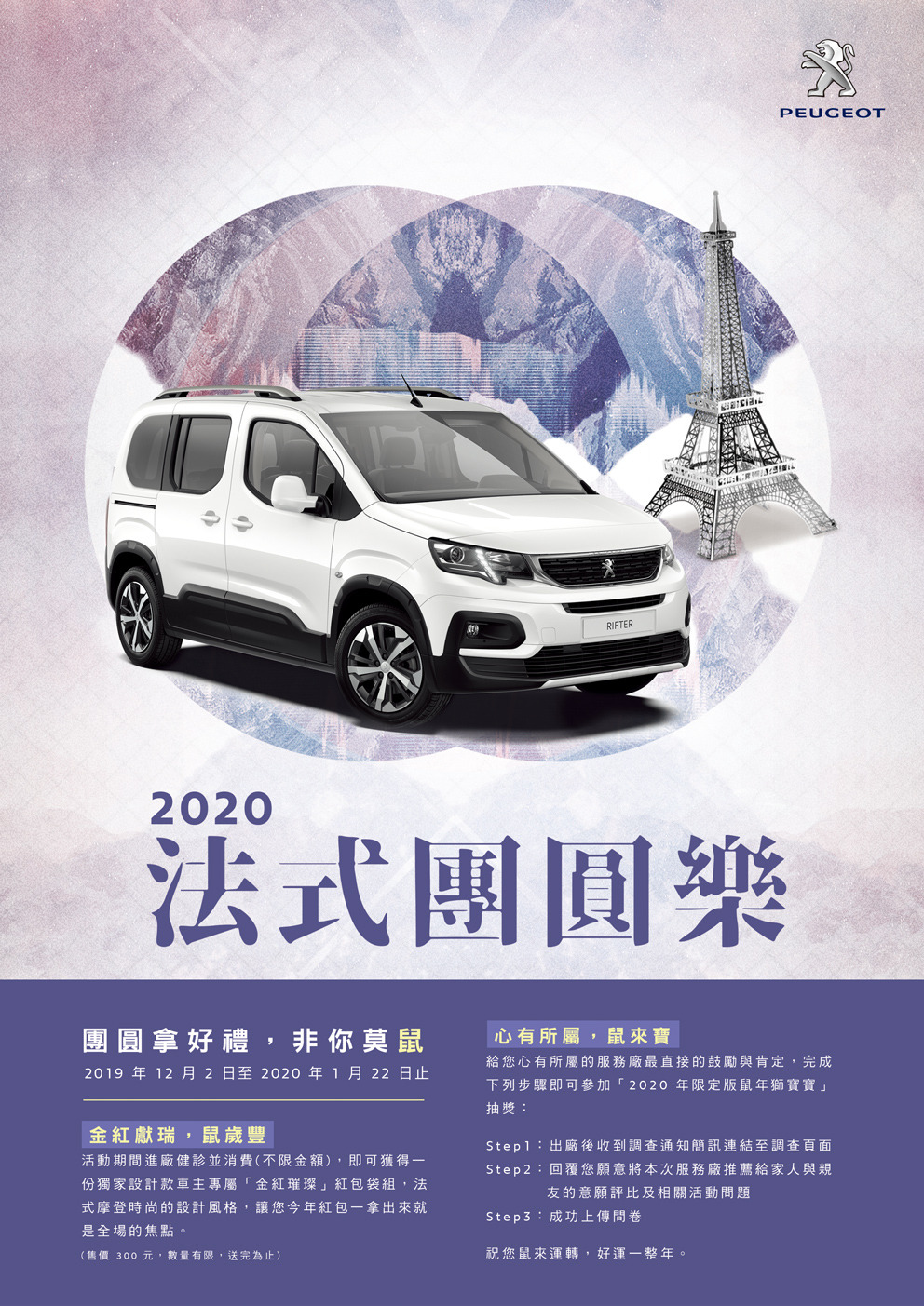 2020年法式團圓樂自2019年12月2日起至2020年1月22日於全台授權服務廠展開新春健診服務,凡於活動期間內回廠即可享包含引擎室、底盤、功能操作及電瓶等多項系統免費健診;除此之外,PEUGEOT與您一同關懷車輛的定期保養,活動期間除車輛保養相關零件85折及保養機油6折起優惠,另提供鈑烤特惠,消費不限金額還可獲得一份獨家設計款金紅璀璨紅包袋組,低調奢華的霧金與內斂貴氣的紫紅極致完美搭配,帶著法式 "Bonne Année" 滿滿新春祝福,讓您一拿出手,就是注目的焦點,專屬限定好禮,非您莫"鼠"。