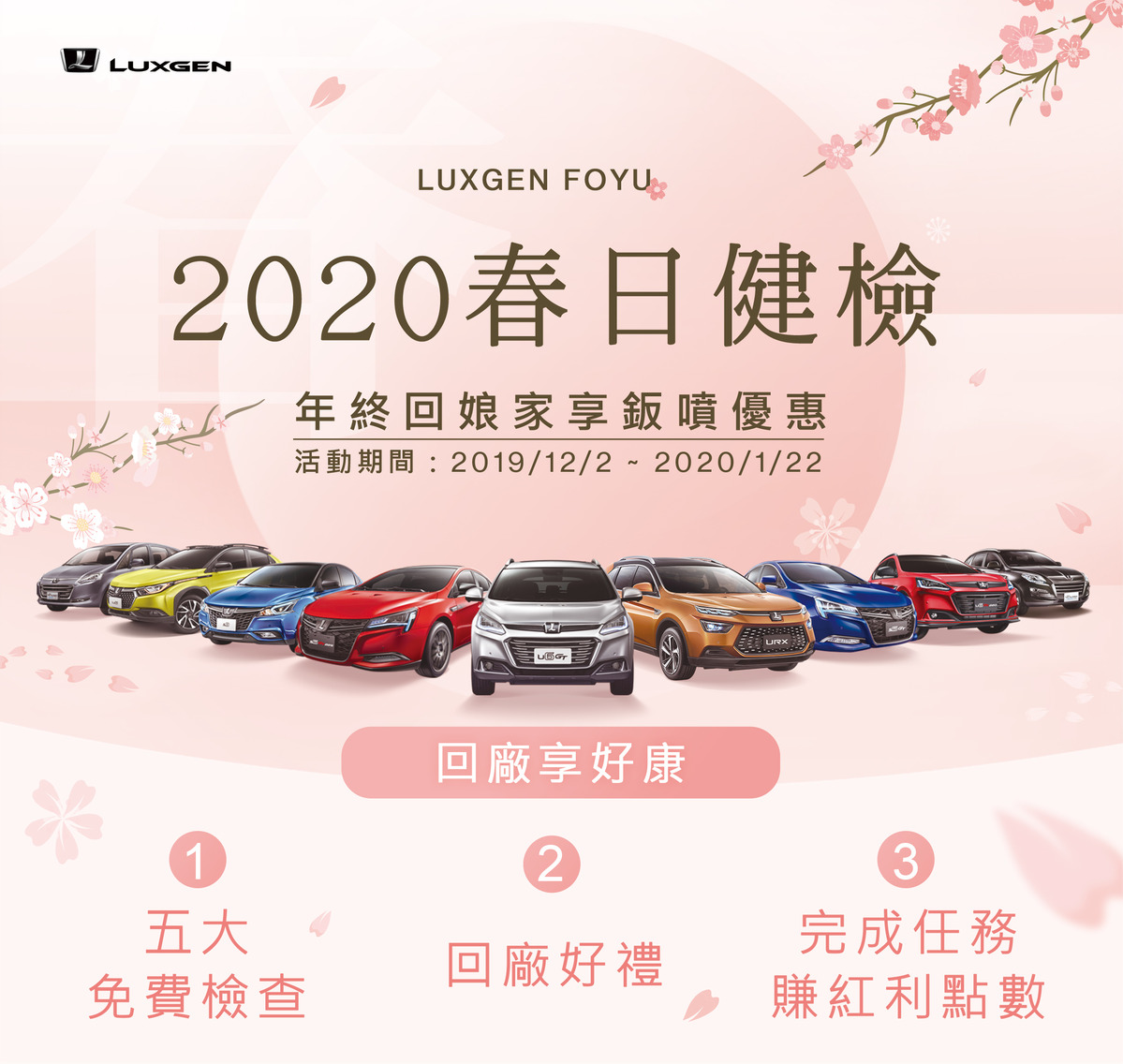 LUXGEN因應即將到來的春節假期,不管是返鄉探親或出遊賞春,行車安全為首重要務,LUXGEN自2019年12月2日至2020年1月22日止,正式展開2020「LUXGEN FOYU春日健檢」活動。凡於活動期間,回廠車主即享有免費行車安全檢查、輪胎安全檢查、前瞻科技檢查及引擎室檢查;即早預約回廠健檢,LUXGEN特別準備納福迎春紅包袋一組(1)與車主一同迎新年,消費滿4,000元再送URX限量筆記本一本,LUXGEN提醒車主們為春節返鄉出遊及早預作準備。