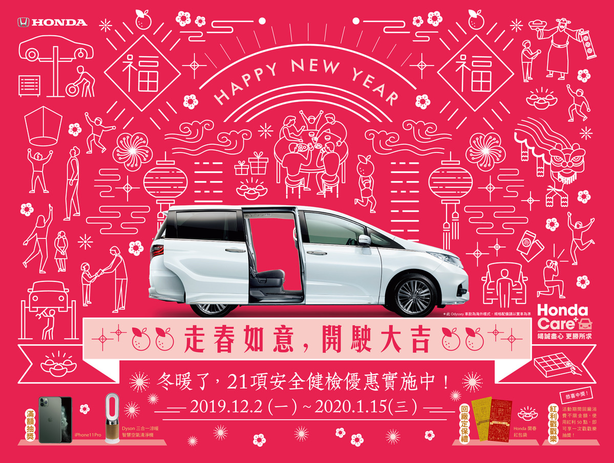 即日起至2020年1月15日止,回廠即享免費健檢,多重優惠即刻開跑,滿額就送限量Honda優質法蘭絨毯,加碼再抽iPhone 11 Pro等大獎,讓車主與家人一起開運走春賀新年。