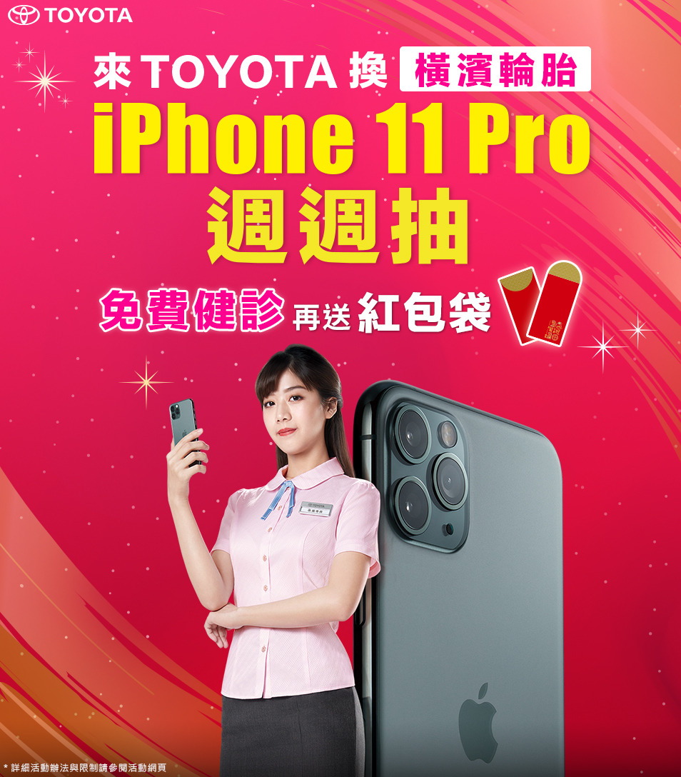 又到了年末,車廠紛紛祭出好康優惠,TOYOTA台灣總代理和泰汽車即日起至12月31日祭出歲末大回饋,換橫濱輪胎71折起、週週抽iPhone 11 Pro 256G(價值新台幣41,400元)、回廠即享免費健診等多重優惠,與車主一起迎接新的一年。
