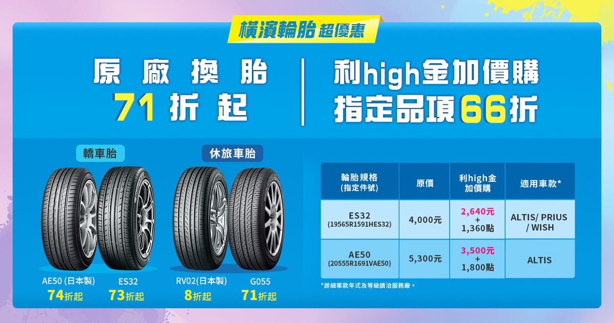 歲末年終出遊、返鄉之際,長時間使用車輛機率較高,「高速公路及快速公路交通管制規則」規定,輪胎任一點胎紋深度不足1.6mm將處新臺幣3,000~6,000元罰鍰。TOYOTA提供日系高品質橫濱輪胎最低71折優惠(註1),保證使用1年內新胎(註2)、同時享有「5年品質保固、免費換新胎」保障(註3),購買2條以上還可週週抽iPhone 11 Pro 256G,多次中獎機會、越早買越划算(註4)。